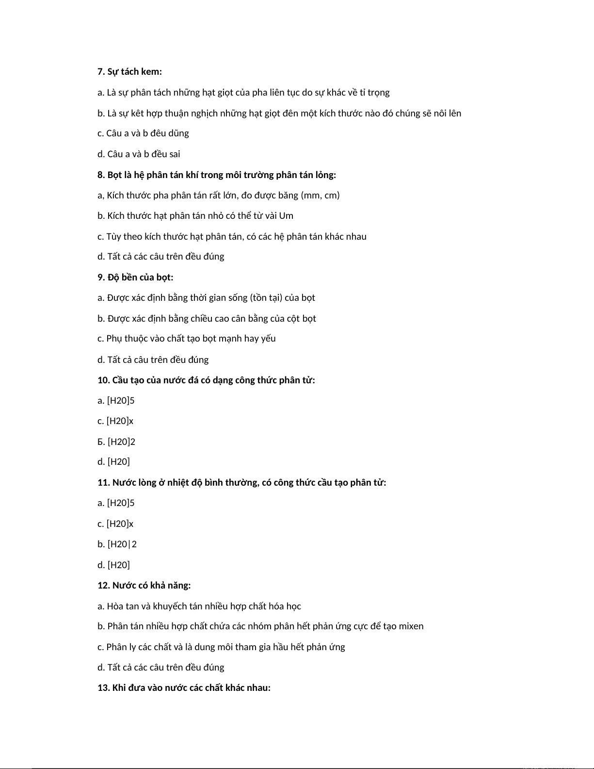 b. Nếu ≤ 75%, tạo hệ nhũ tương đậm đặc, các giọt của pha phân tán dễ kết hợp lại, dễ sa lắng hay nổi lên c. Câu a và b đều đúng d. Câu a và b đều sai 7. Sự tách kem: