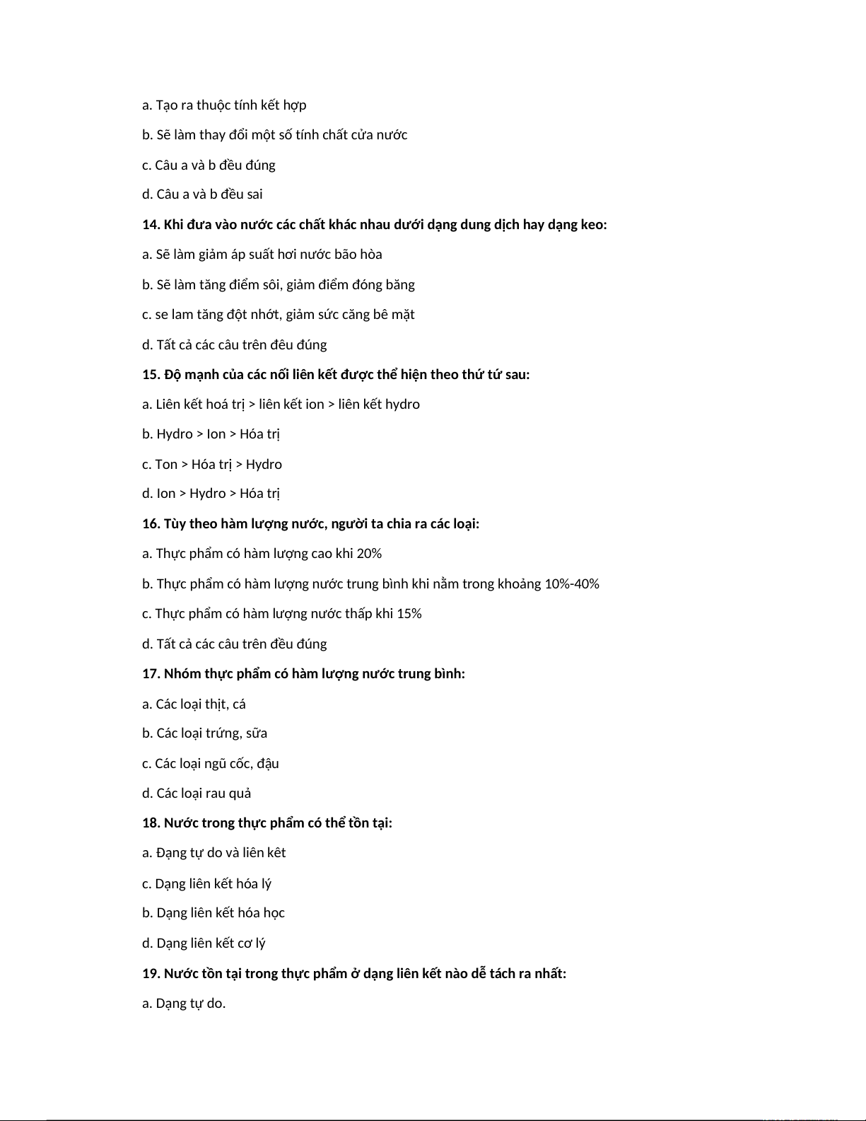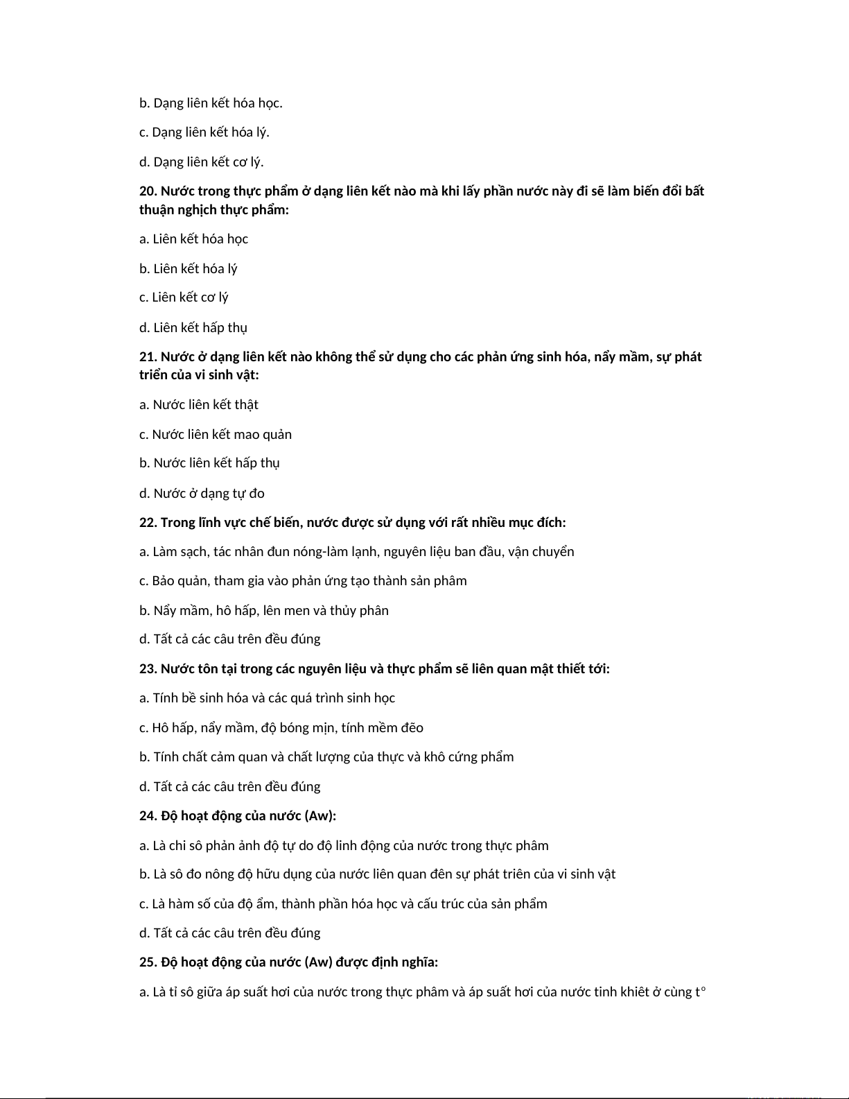 19. Nước tồn tại trong thực phẩm ở dạng liên kết nào dễ tách ra nhất: a. Dạng tự do.