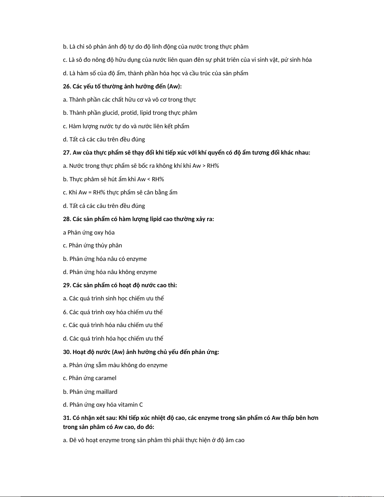 31. Có nhận xét sau: Khi tiếp xúc nhiệt độ cao, các enzyme trong săn phẩm có Aw thấp bên hơn