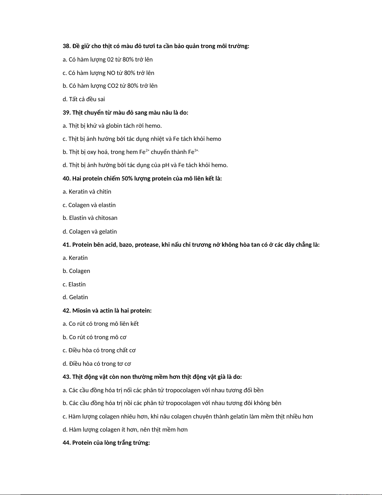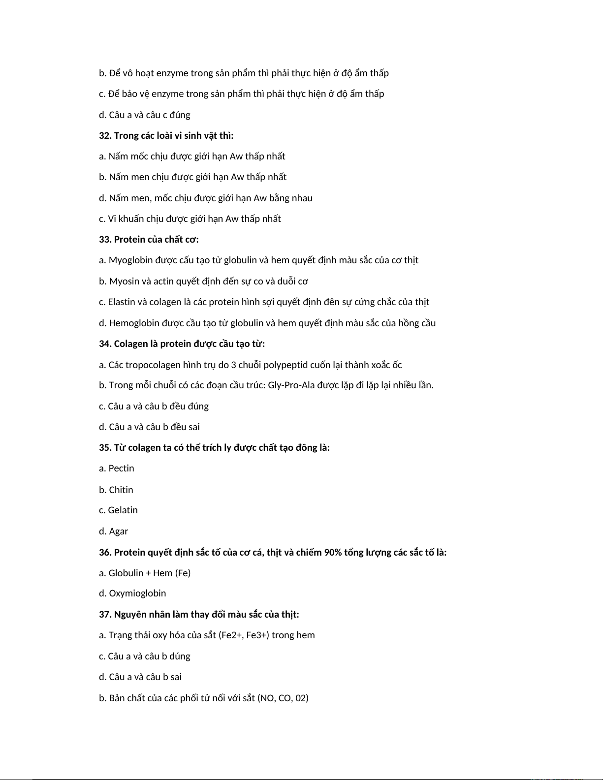 36. Protein quyết định sắc tố của cơ cá, thịt và chiếm 90% tổng lượng các sắc tố là: a. Globulin + Hem (Fe) d. Oxymioglobin