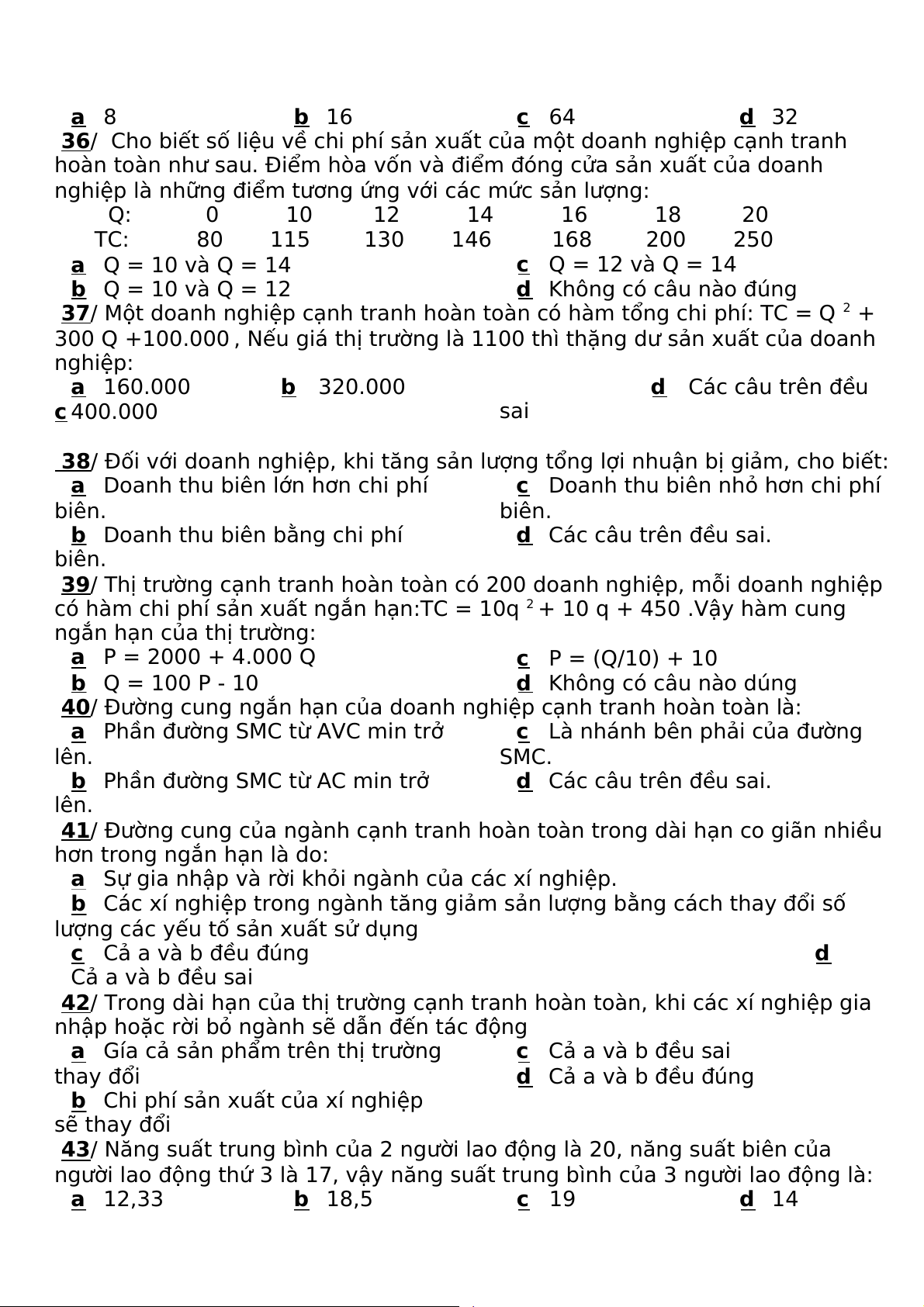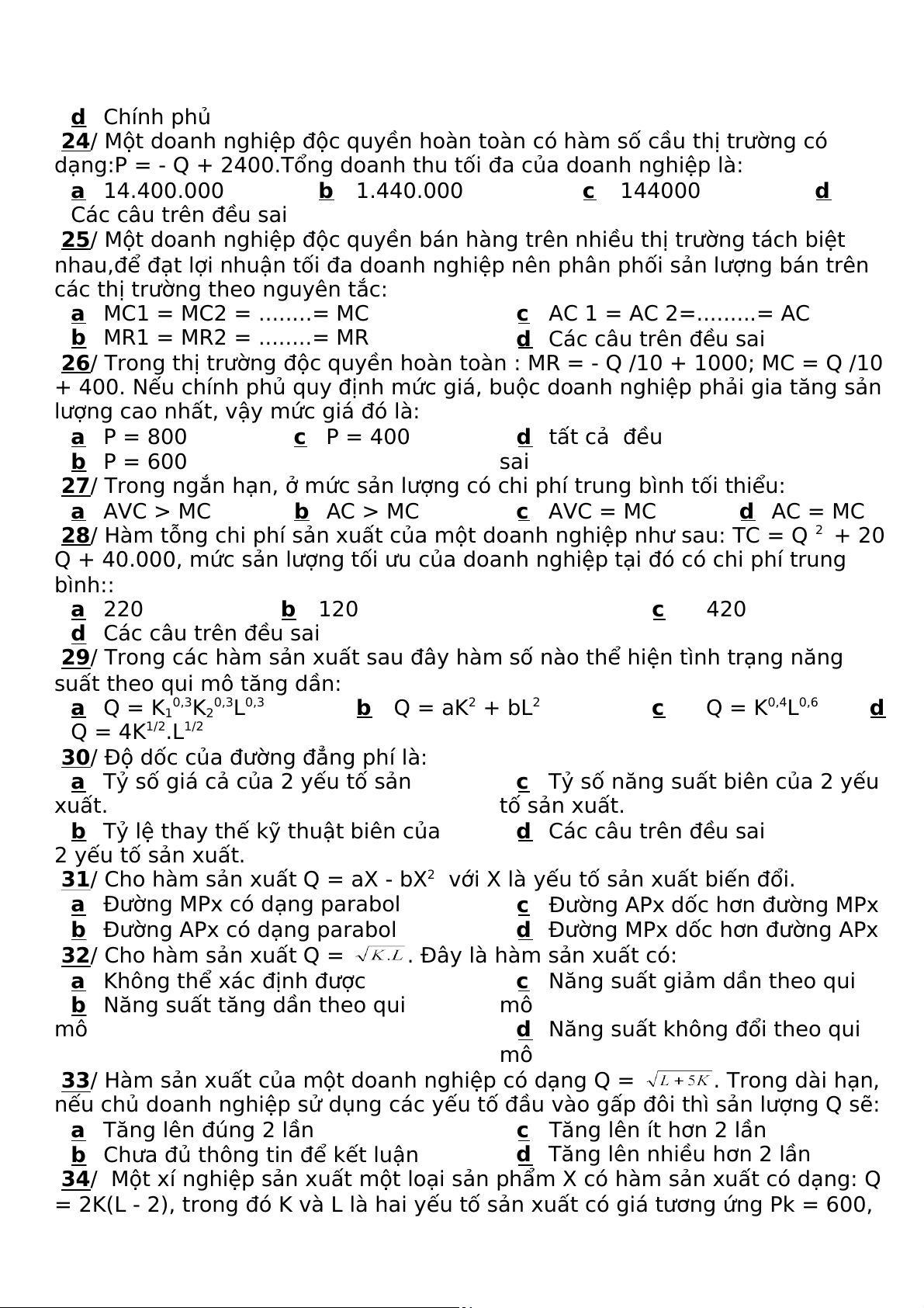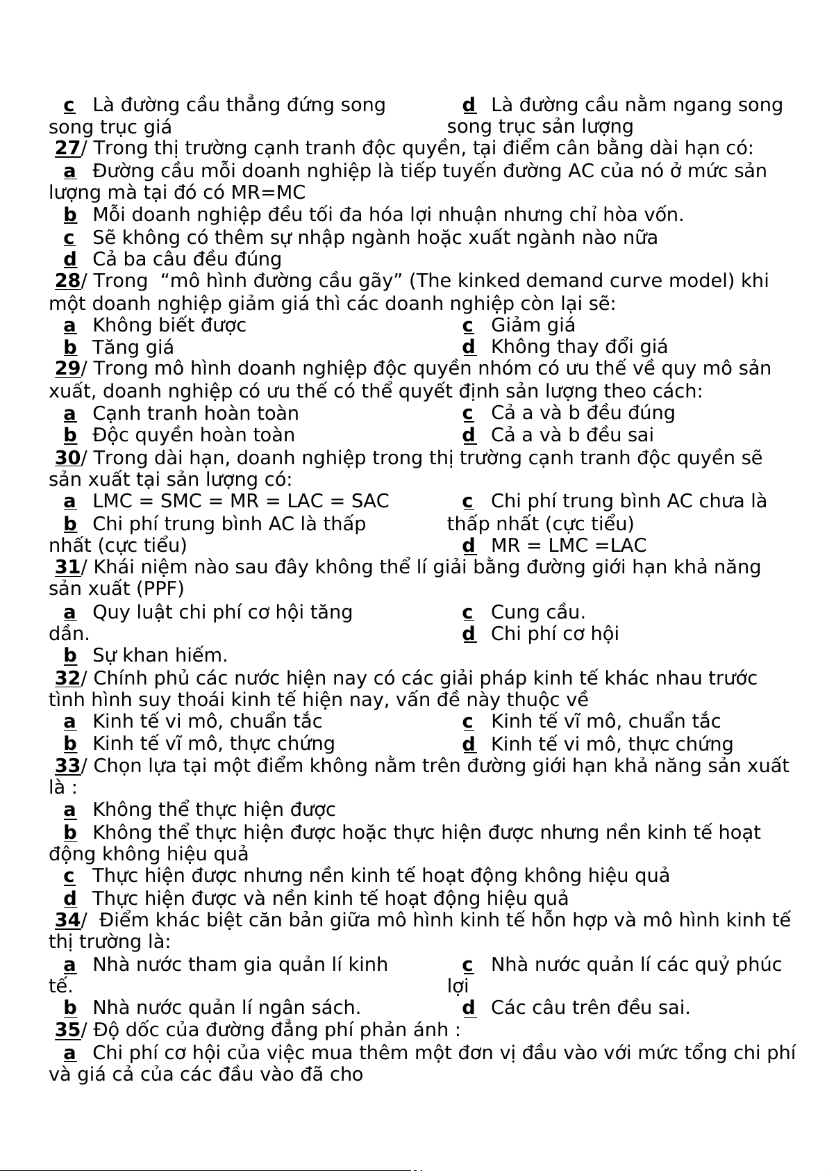 27/ Trong ngắn hạn, ở mức sản lượng có chi phí trung bình tối thiểu: a AVC > MC b AC > MC c AVC = MC d AC = MC