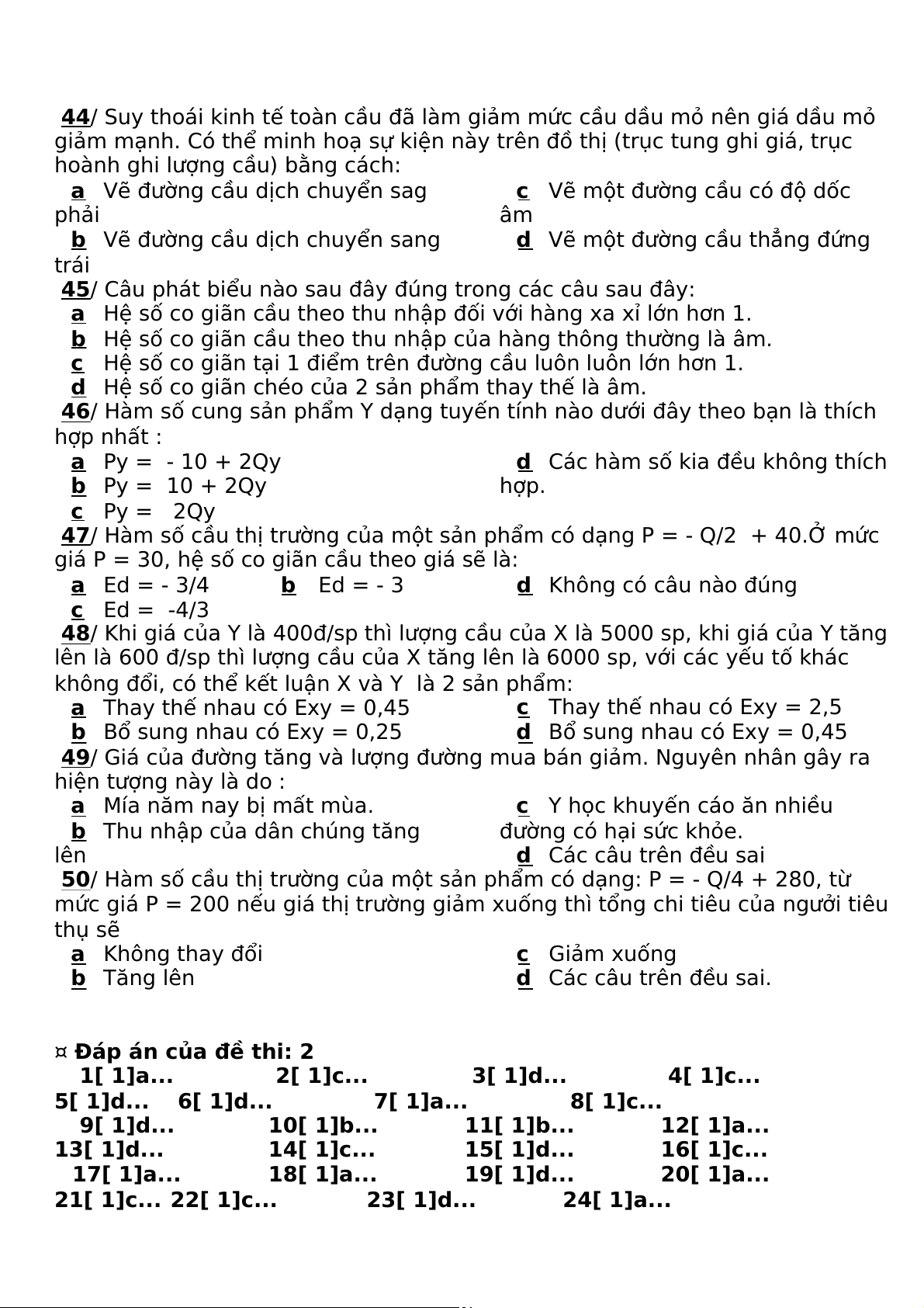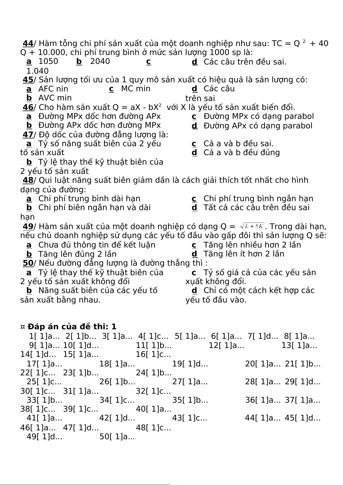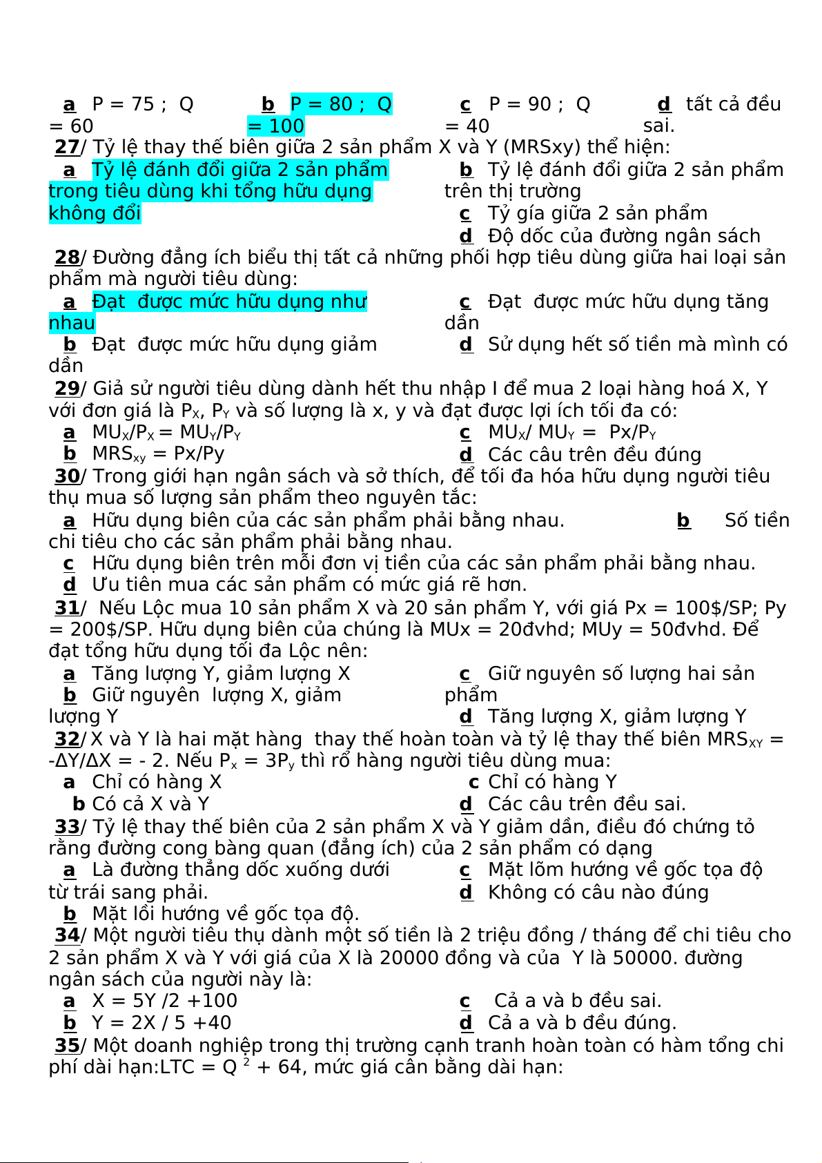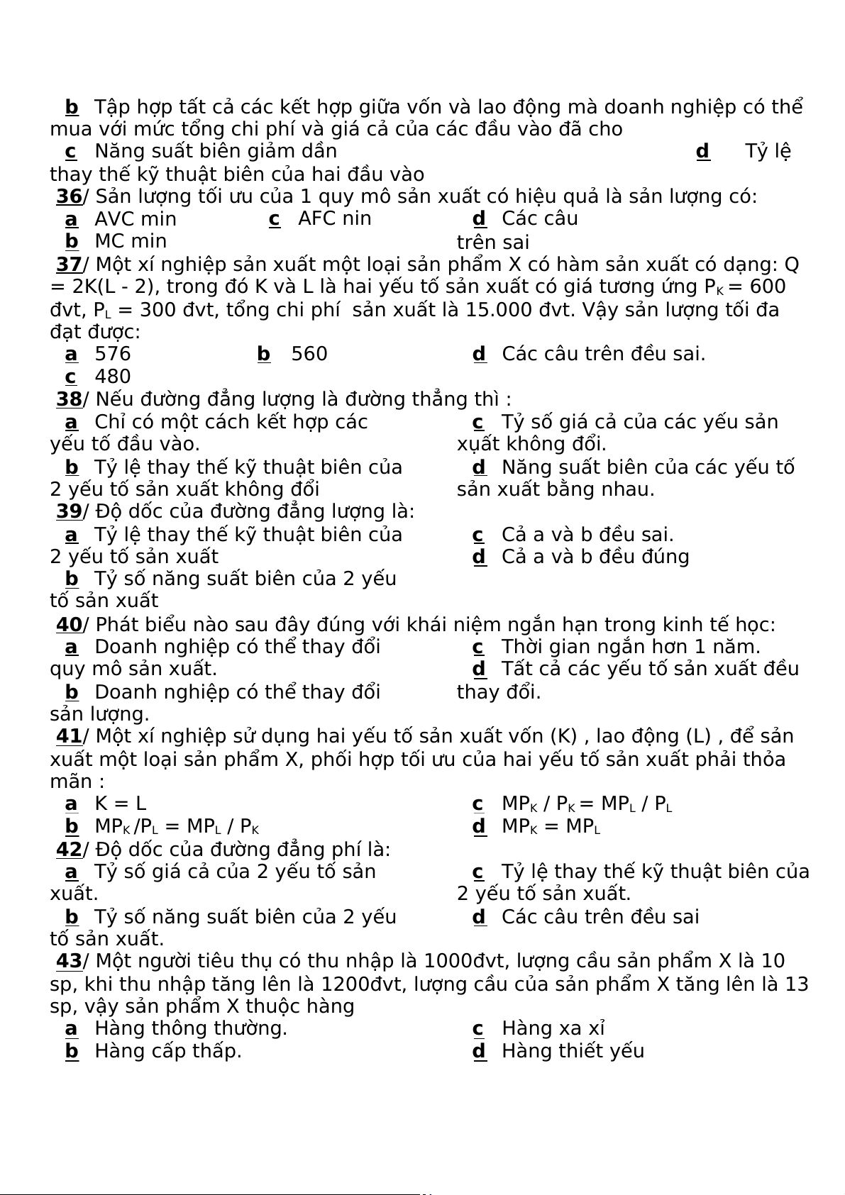 27/ Trong ngắn hạn, ở mức sản lượng có chi phí trung bình tối thiểu: a AVC > MC b AC > MC c AVC = MC d AC = MC