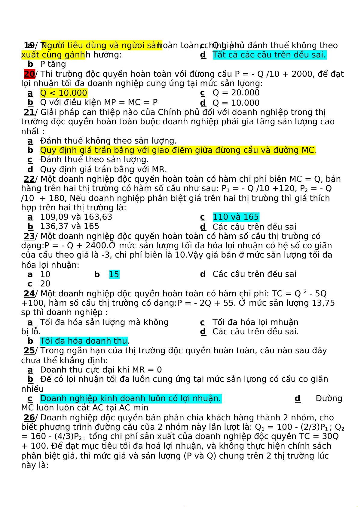 23/ Trong thị trường độc quyền hoàn toàn, chính phủ quy định giá trần sẽ có lợi cho a Người tiêu dùng
