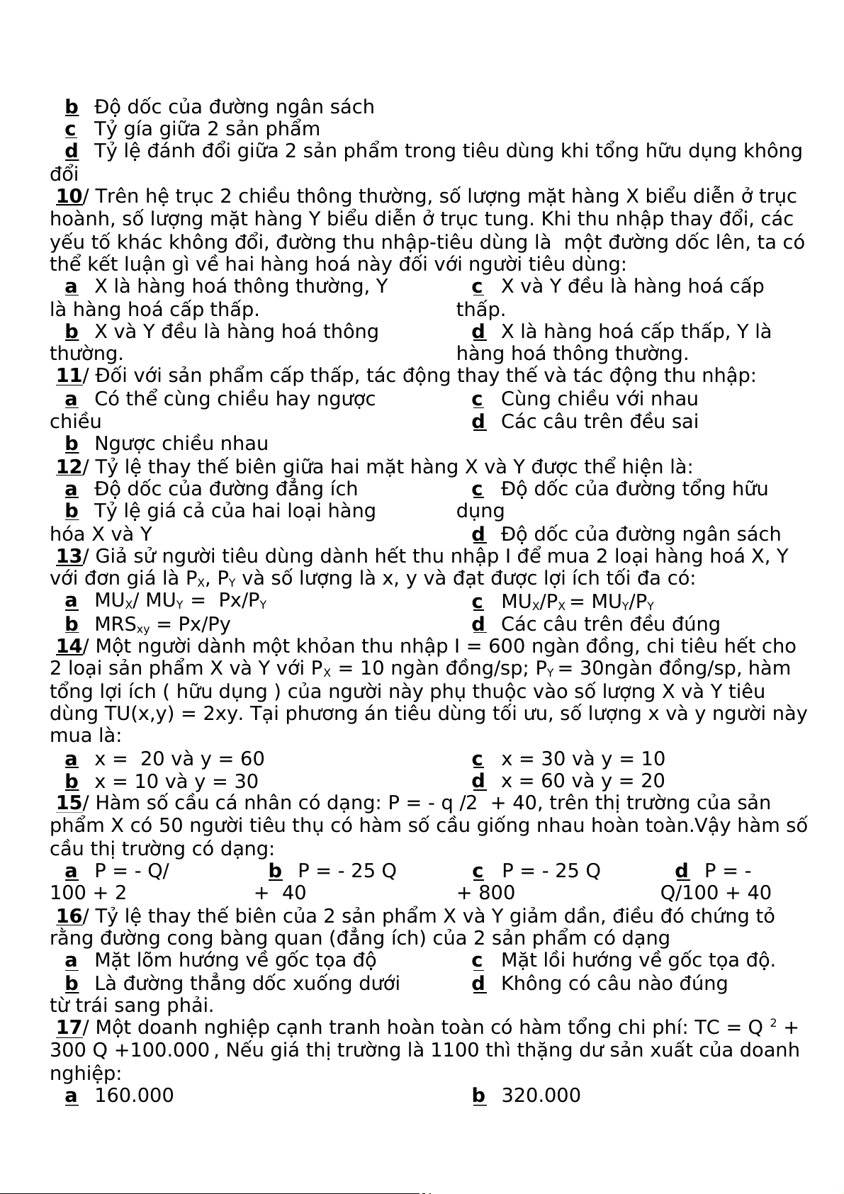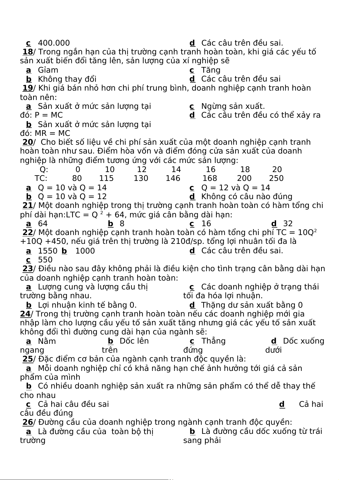 hoàn toàn như sau.Nếu giá trên thị trường là 16đ/sp, tổng lợi nhuận tối đa là Q: 0 10 12 14 16 18 20