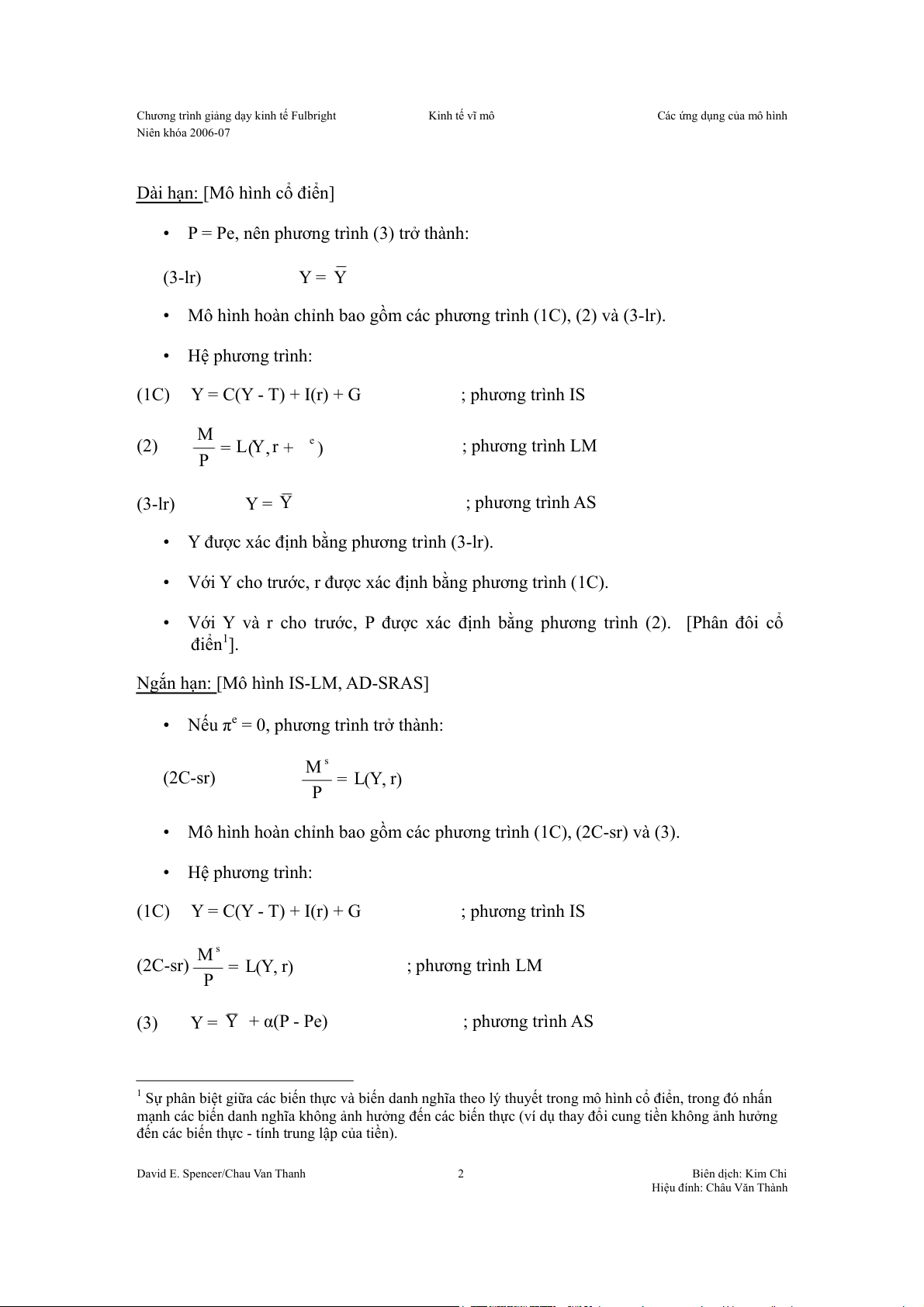 • Mô hình hoàn chỉnh bao gồm các phương trình (1C), (2) và (3-lr). • Hệ phương trình: (1C) Y = C(Y - T) + I(r) + G ; phương trình IS M (2) L Y ( , r e = +π ) ; phương trình LM P (3-lr) Y = Y ; phương trình AS