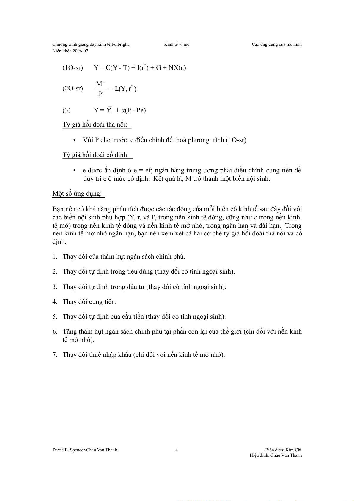 Y = C(Y - T) + I(r) + G + NX(ε) ; phương trình IS M (2) L Y ( , r e = +π ) ; phương trình LM P (3) Y = Y + α(P - Pe) ; phương trình AS (4) r = r* ; nền kinh tế mở nhỏ