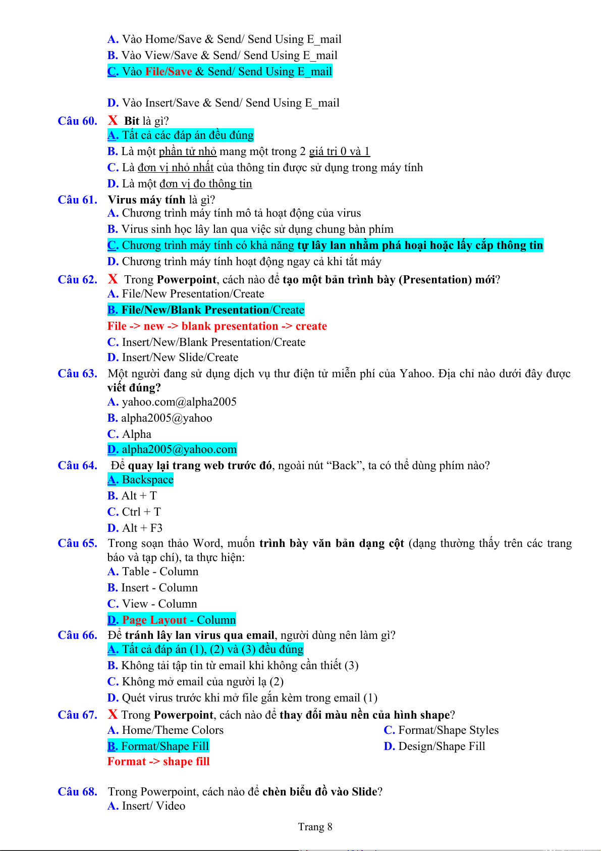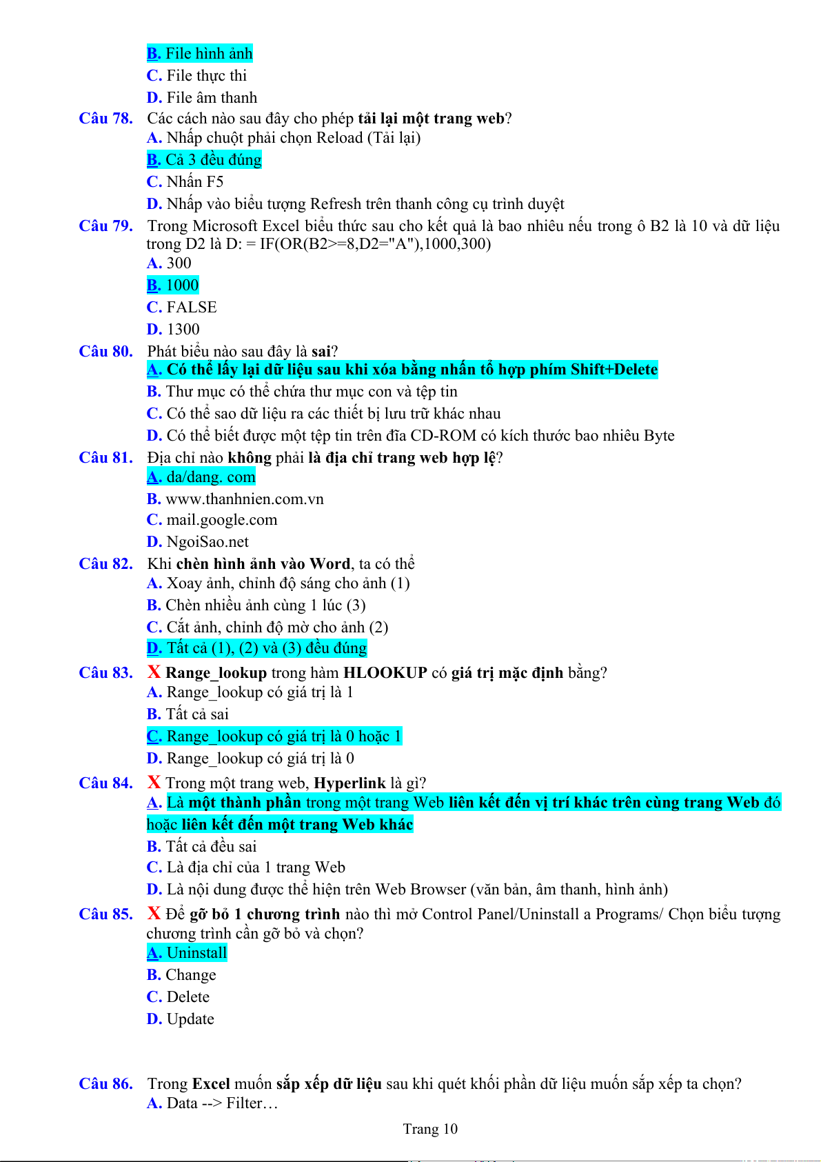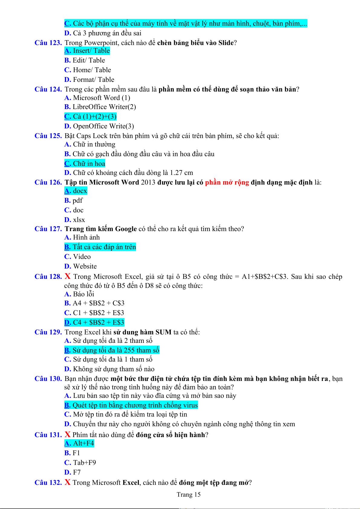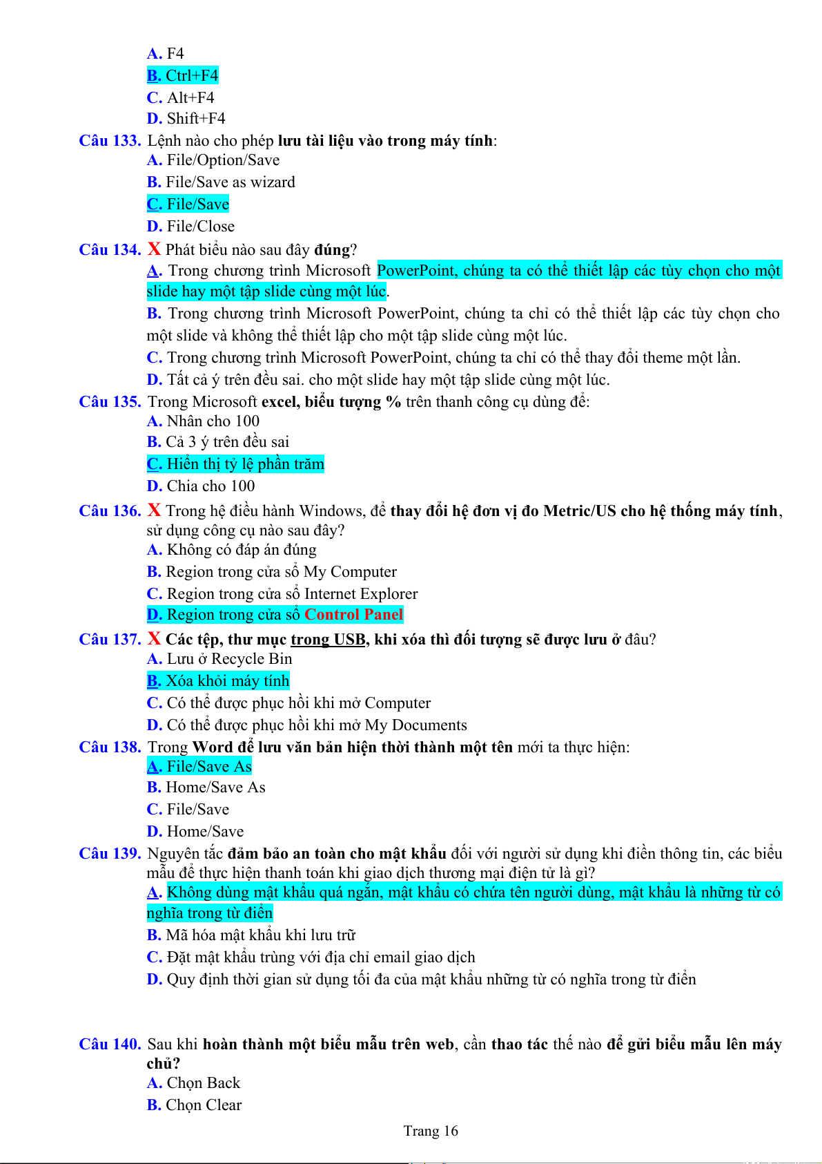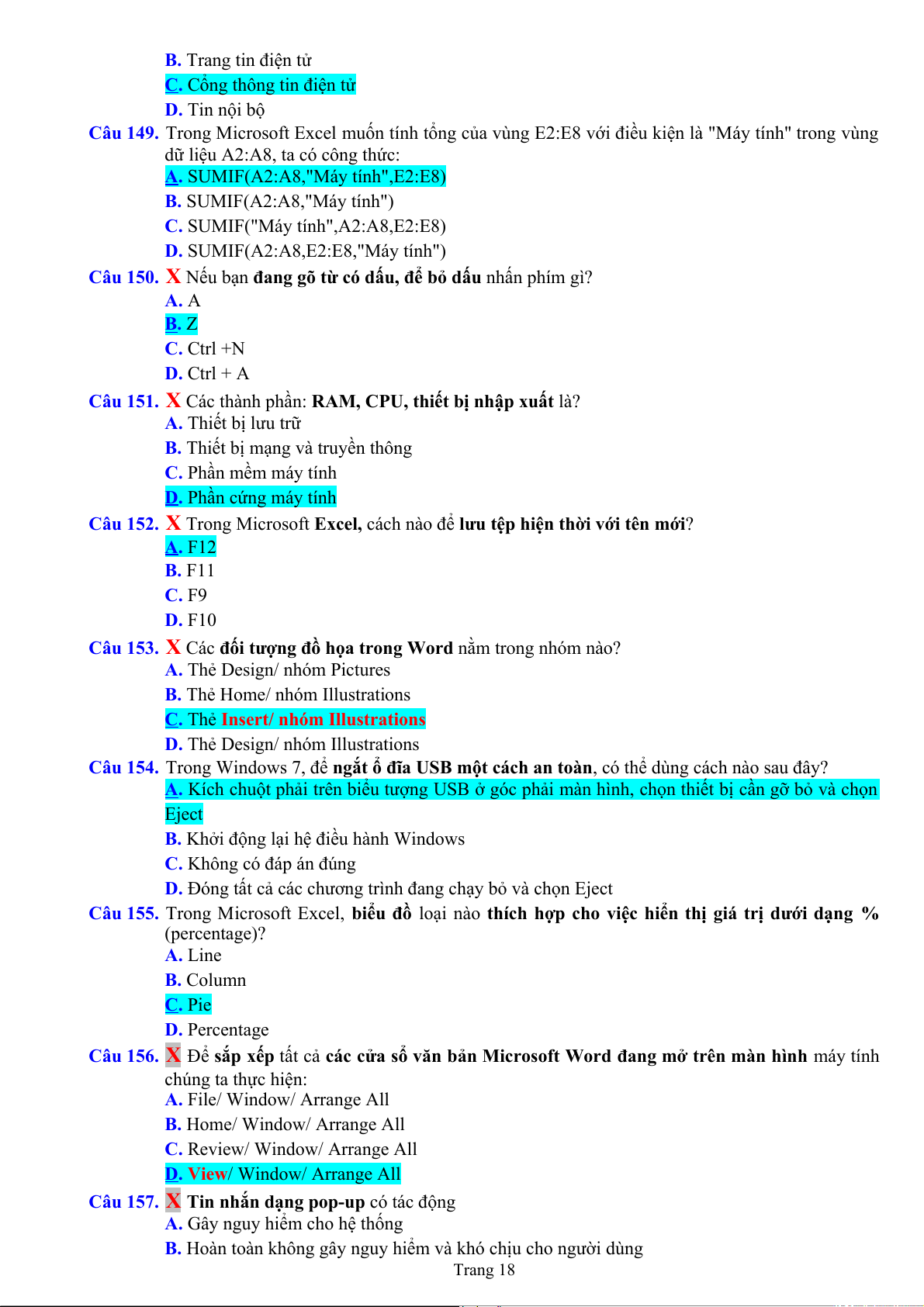 Câu 152. X Trong Microsoft Excel, cách nào để lưu tệp hiện thời với tên mới? A. F12 B. F11 C. F9 D. F10 Câu 153. X Các nằm trong nhóm nào?