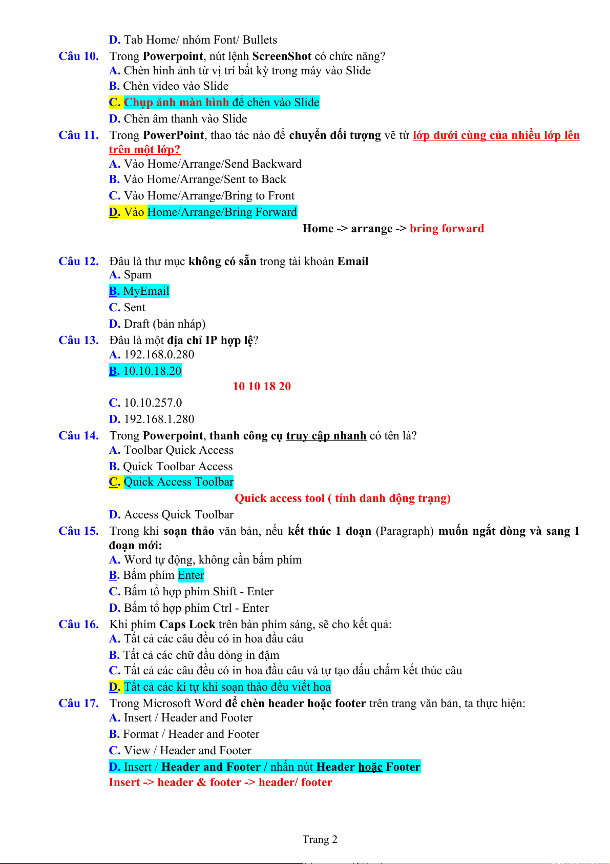 Câu 12. Đâu là thư mục không có sẵn trong tài khoản Email A. Spam B. MyEmail C. Sent D. Draft (bản nháp)