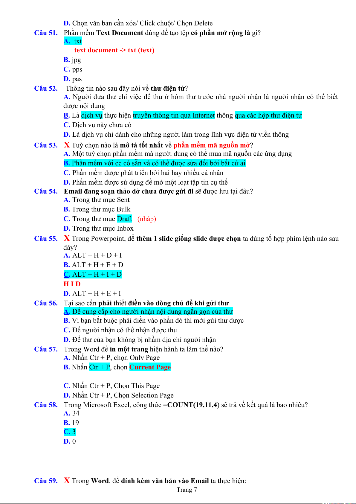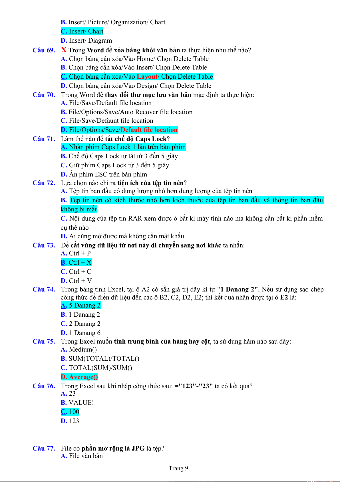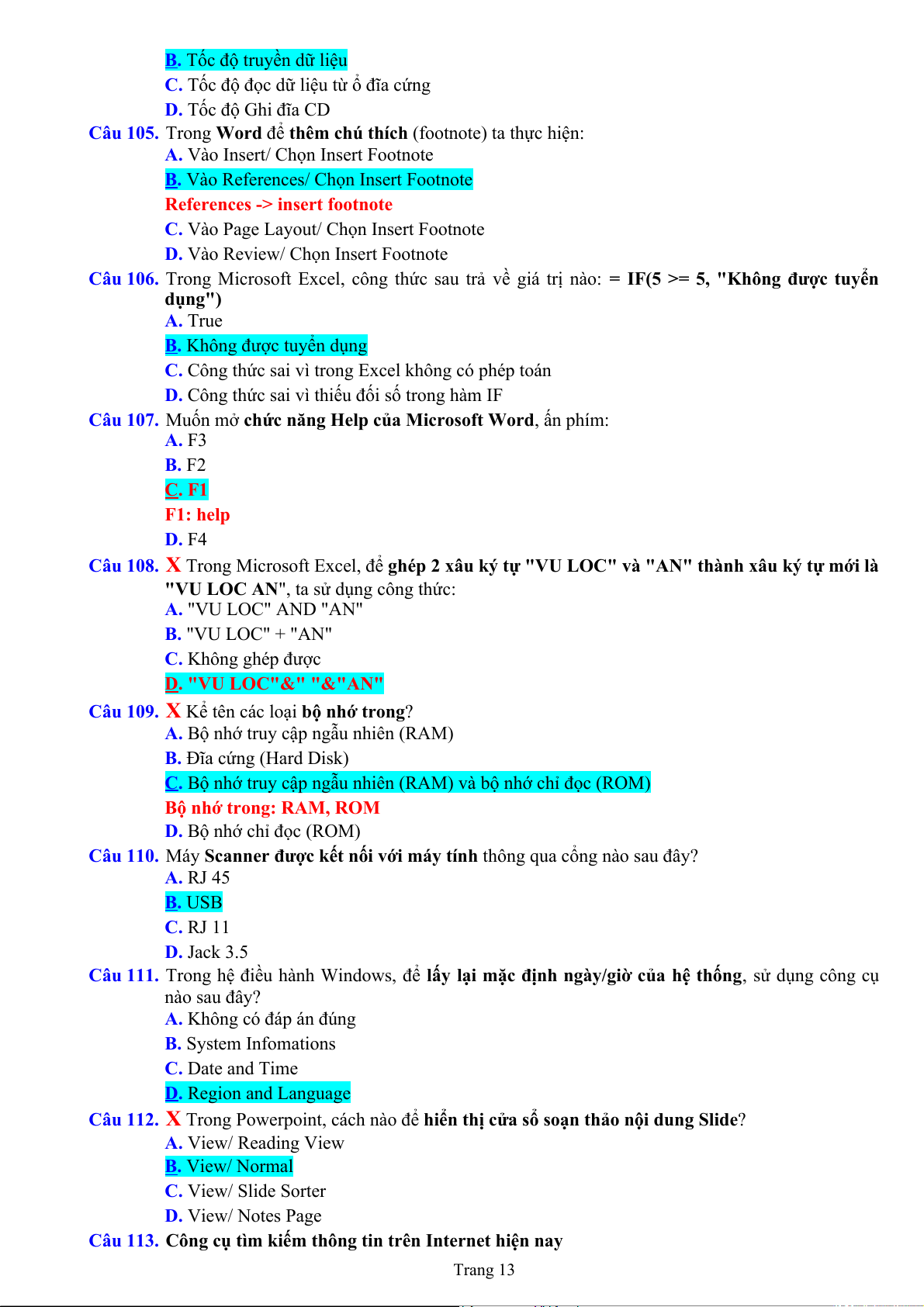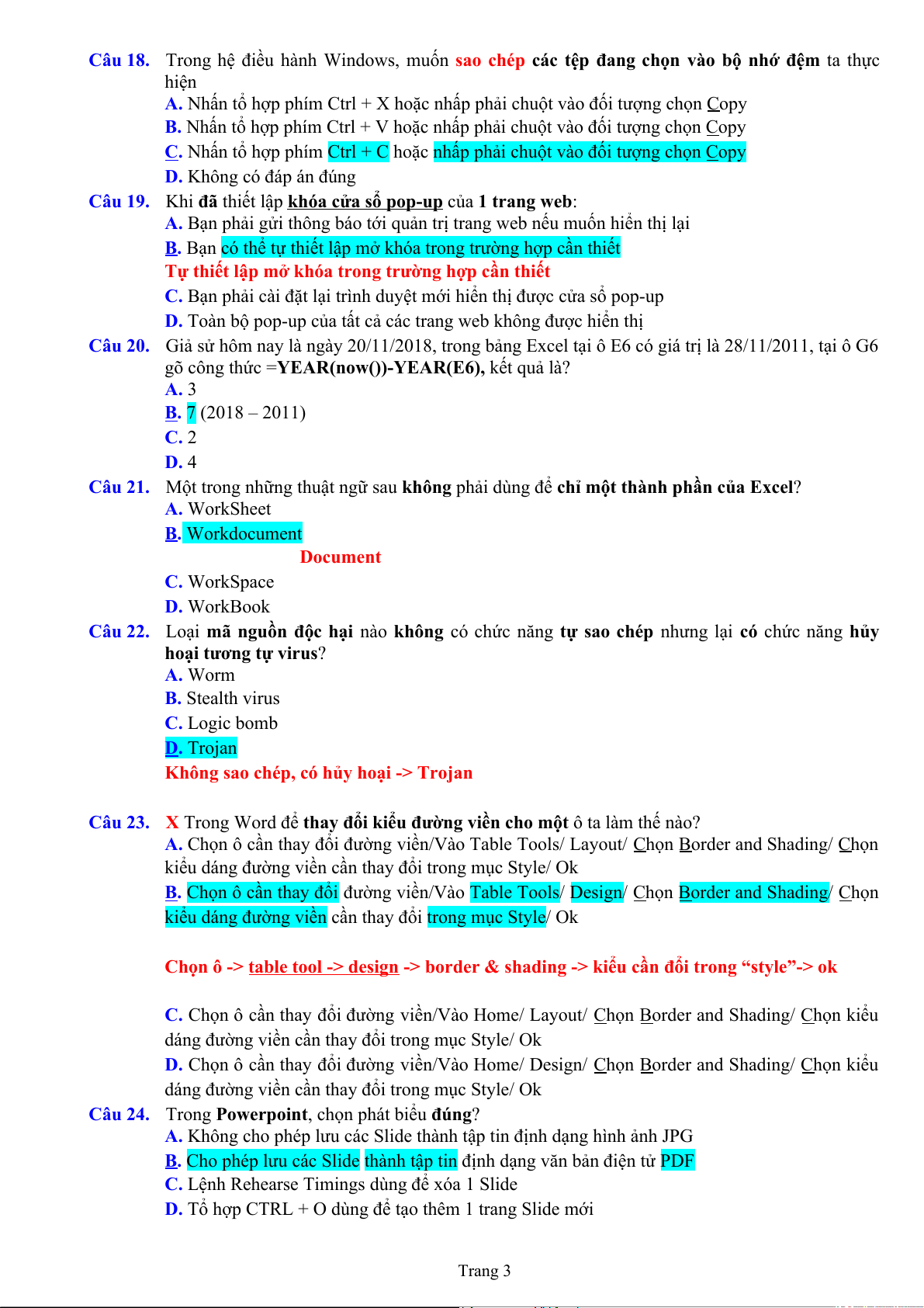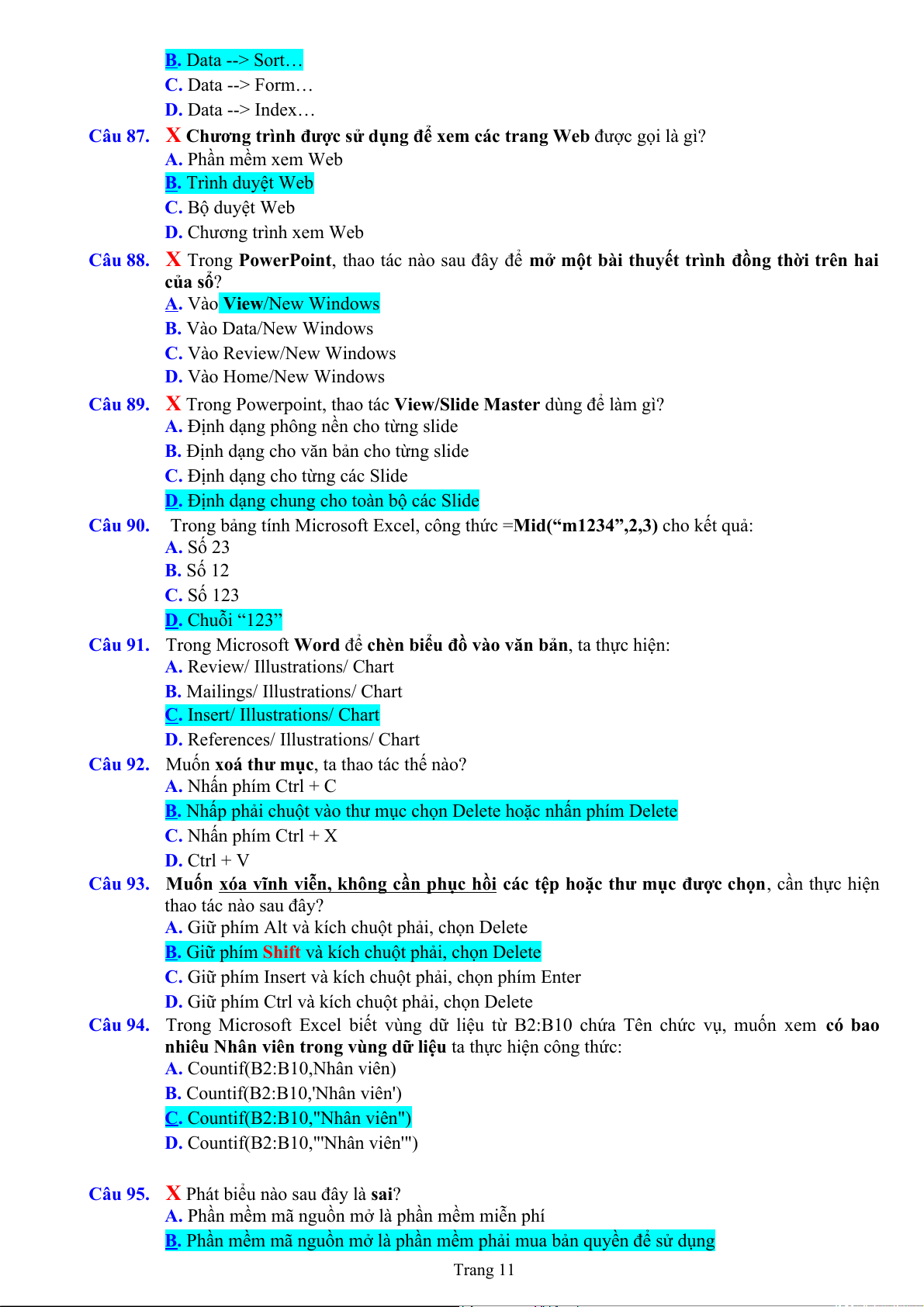 Câu 21. Một trong những thuật ngữ sau không phải dùng để chỉ một thành phần của Excel? A. WorkSheet B. Workdocument Document C. WorkSpace D. WorkBook