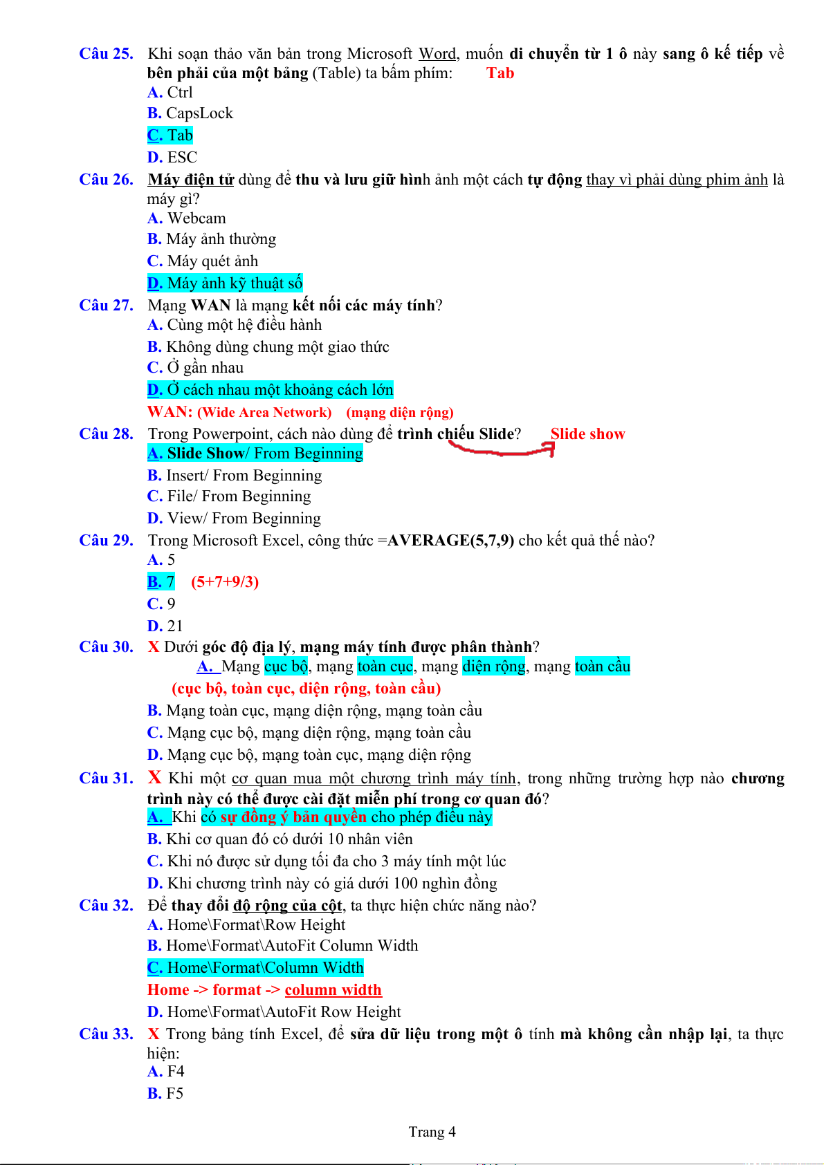 Câu 25. Khi soạn thảo văn bản trong Microsoft Word, muốn di chuyển từ 1 ô này sang ô kế tiếp về