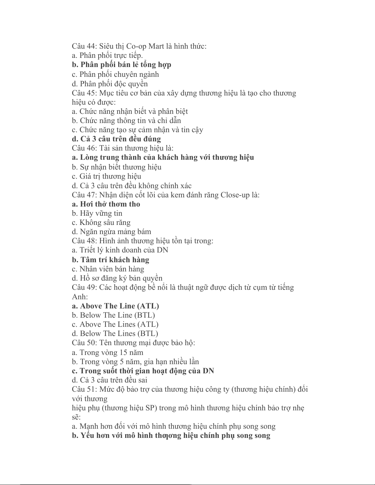 Câu 49: Các hoạt động bề nổi là thuật ngữ được dịch từ cụm từ tiếng Anh: a. Above The Line (ATL) b. Below The Line (BTL) c. Above The Lines (ATL) d. Below The Lines (BTL)