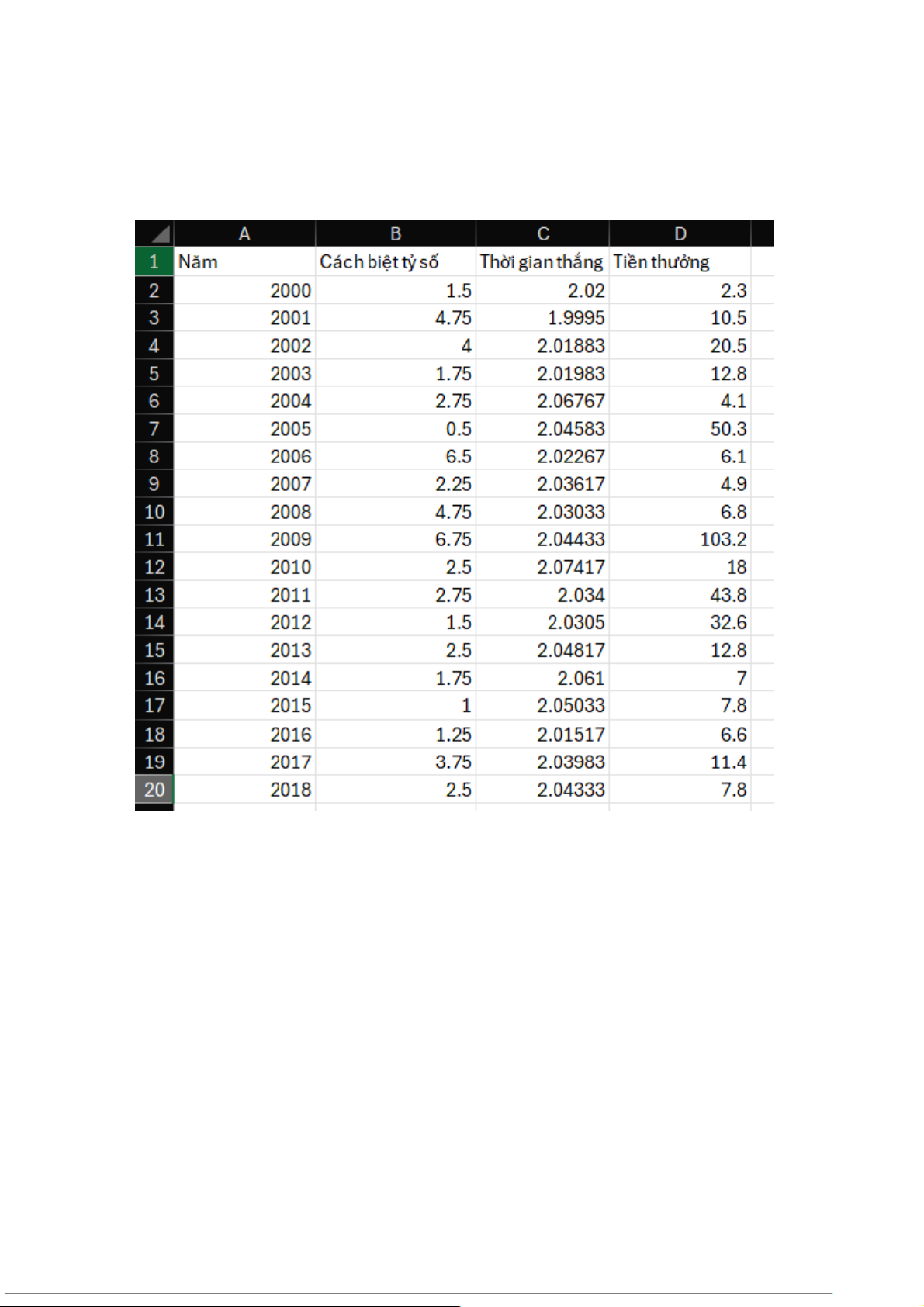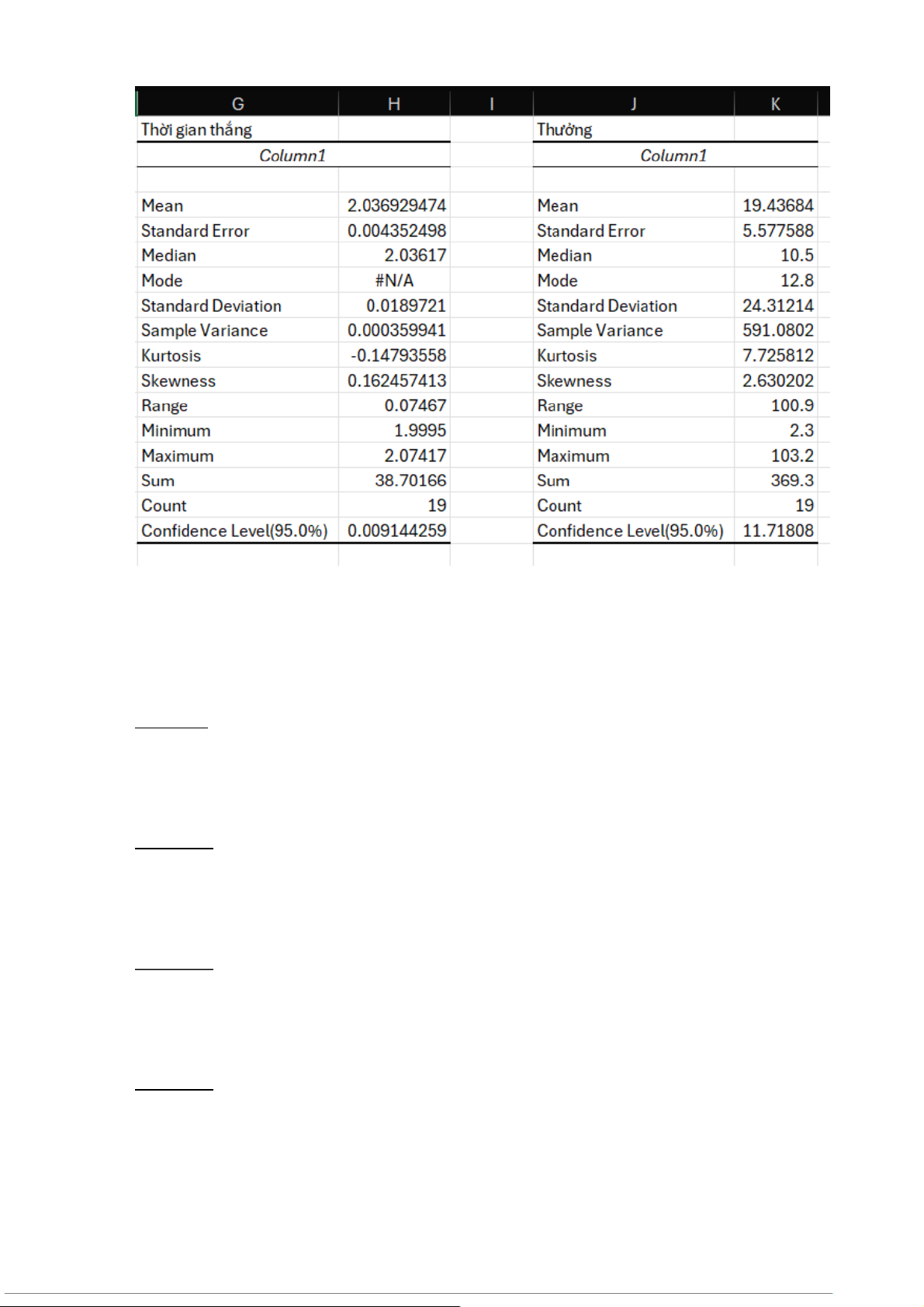 Sử dụng Excel: Data Analysis cho thời gian thắng và tiền thưởng ta được kết quả như sau: 7 a.