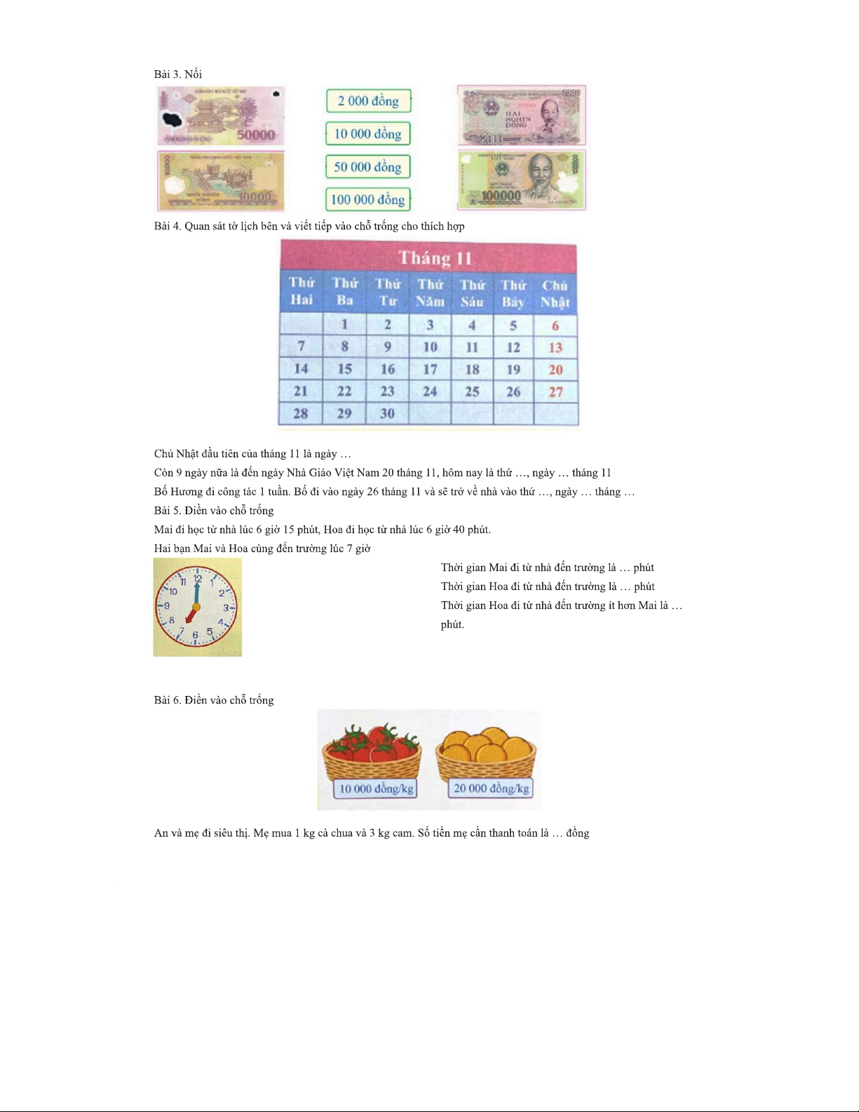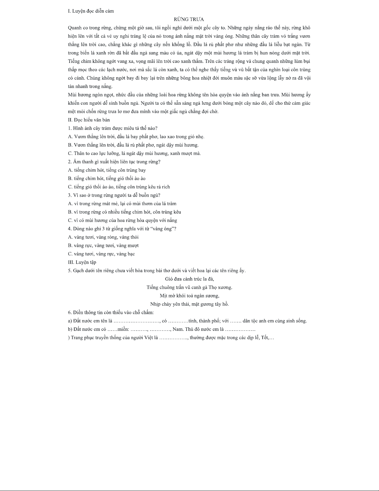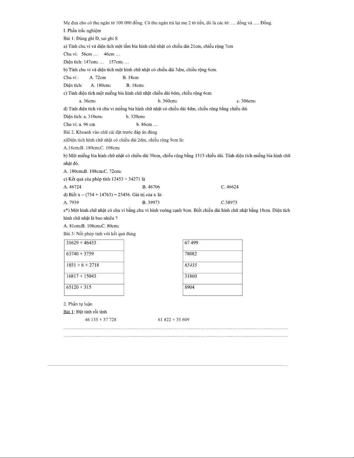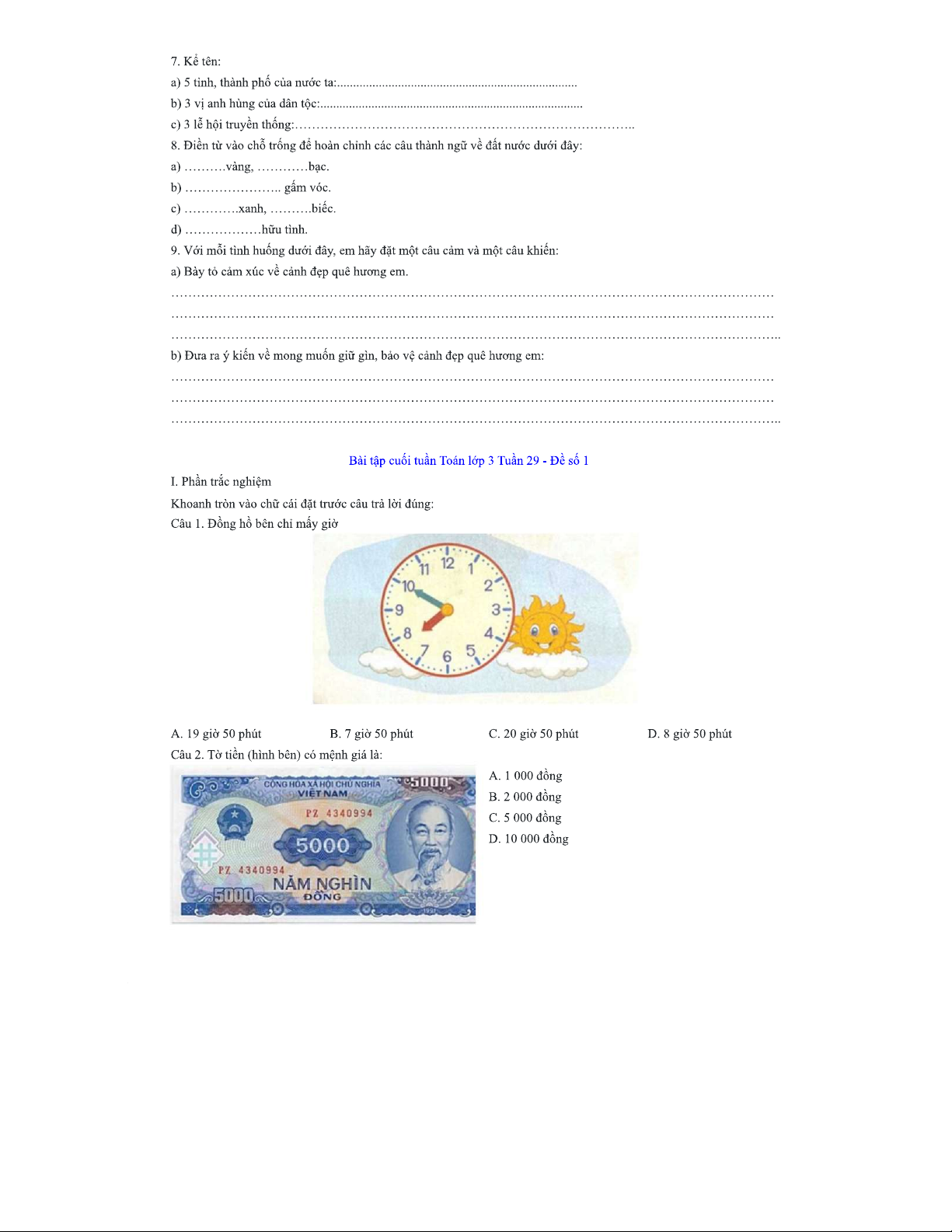 Tổng hợp bài thi - Văn và Toán lớp 3, Tuần 29, Đề số 1