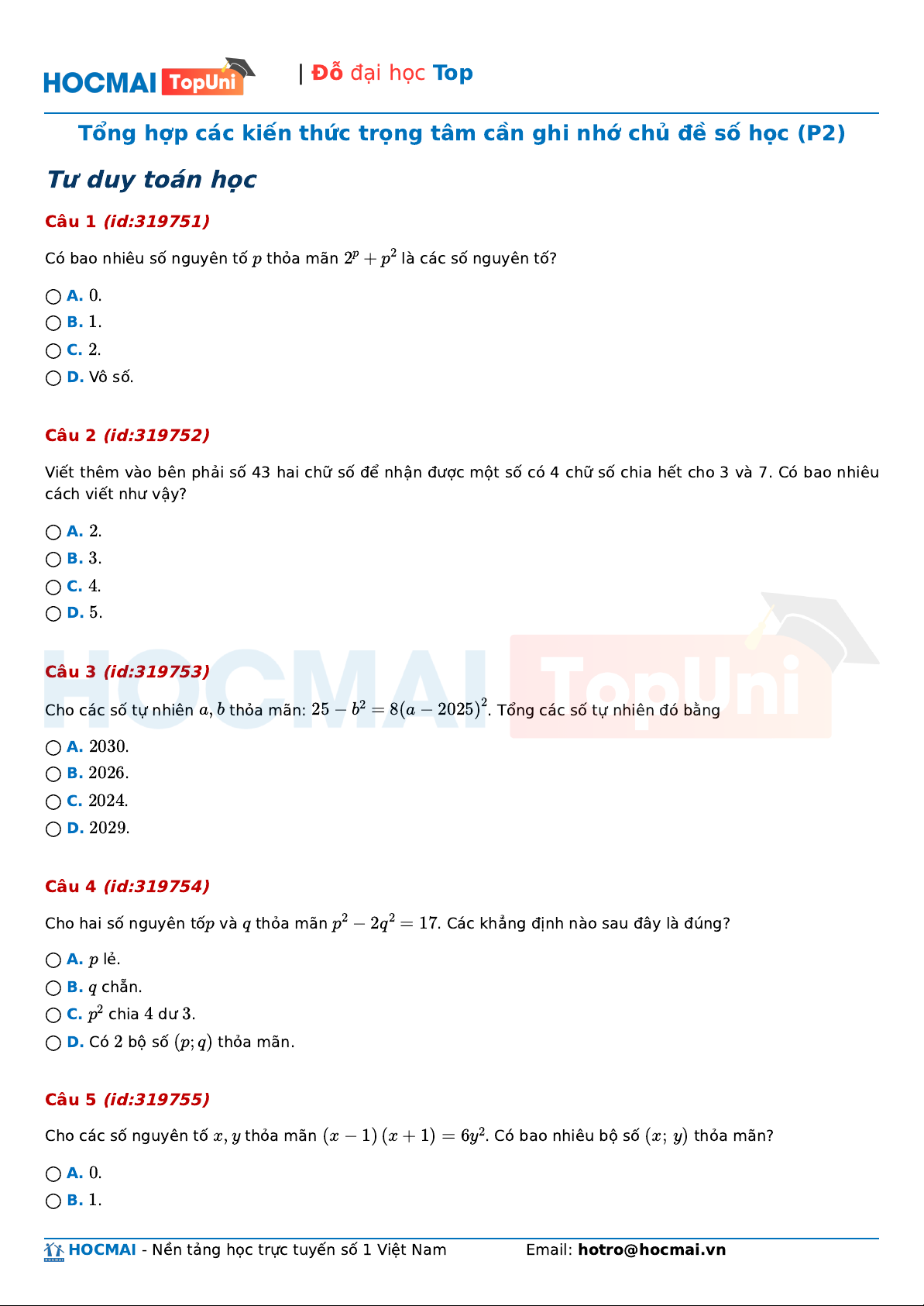 b thỏa mãn: 25 − b2 = 8(a − 2025) .2 Tổng các số tự nhiên đó bằng ◯ A. 203 . 0 ◯ B. 202 . 6 ◯ C. 202 . 4 ◯ D. 202 . 9 Câu 4 (id:319754) Cho hai số nguyên tố