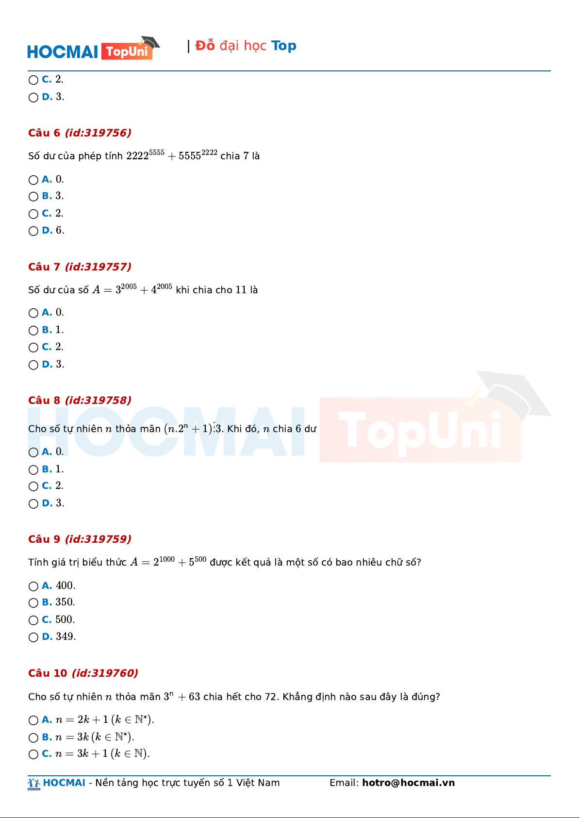 Số dư của số A = 32005 + 4200 5 khi chia cho 1 1 là ◯ A. . 0 ◯ B. . 1 ◯ C. . 2 ◯ D. . 3 Câu 8 (id:319758) Cho số tự nhiên