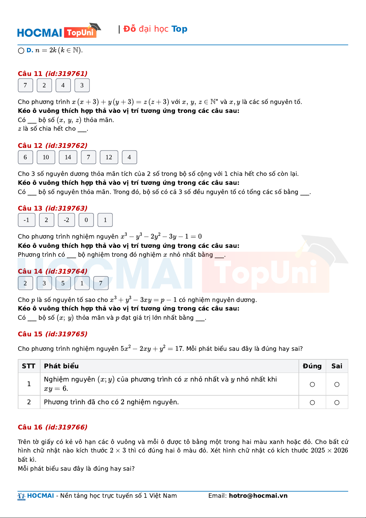 ) của phương trình có x nhỏ nhất và y nhỏ nhất khi 1 ○ ○ xy = . 6 2 Phương trình đã cho có 2 nghiệm nguyên. ○ ○ Câu 16 (id:319766)