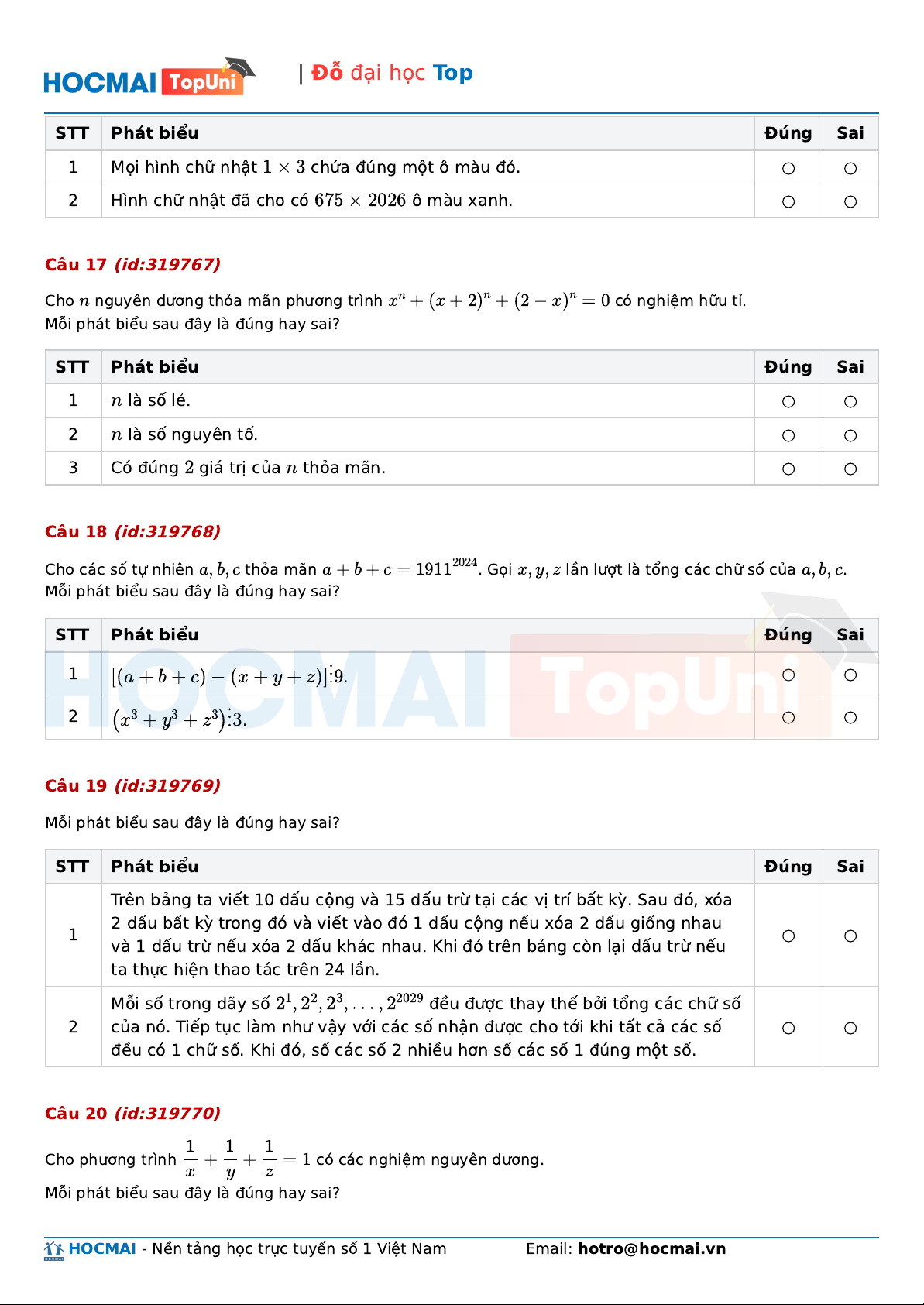 | Đỗ đại học Top STT Phát biểu Đúng Sai 1