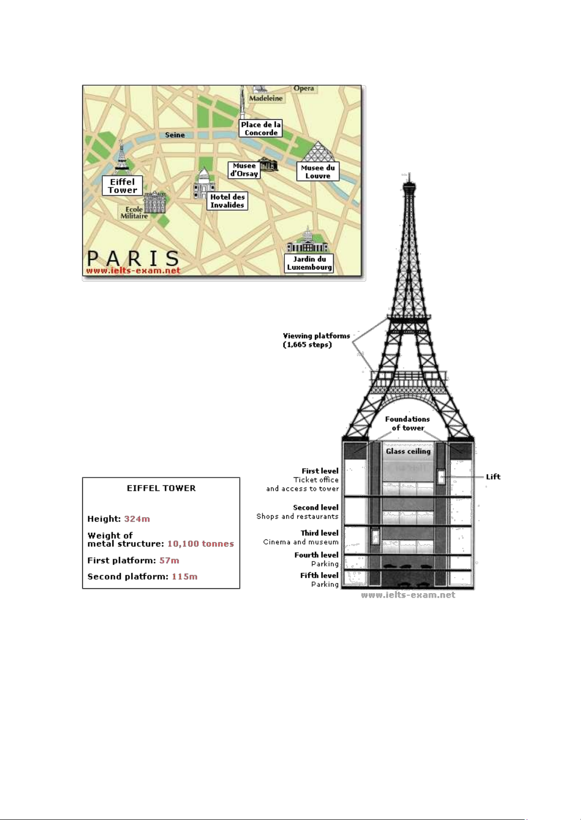 The diagrams below give information about the Eiffel Tower in Paris and an outline project to extend it underground.