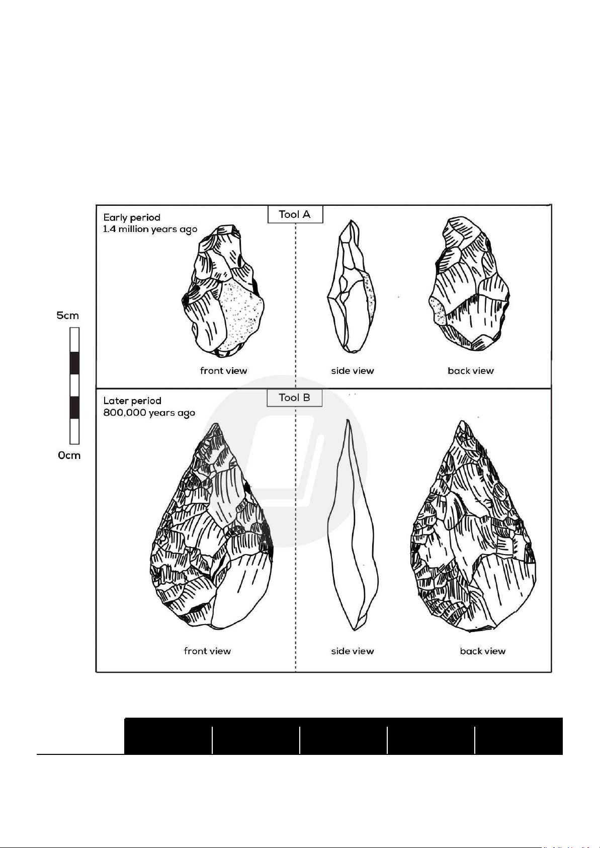 Write at least 150 words. OUTLINE: Period Size Front view Side view Back view thick not 1.4 million years Tool A 5cm high asymmetrical effective at rough ago cutting Tool B 800.000 years ago 7.5 cm high symmetrical tear- thin, sharp smooth drop shaped edge effective at cutting SAMPLE REPORT: Introduction