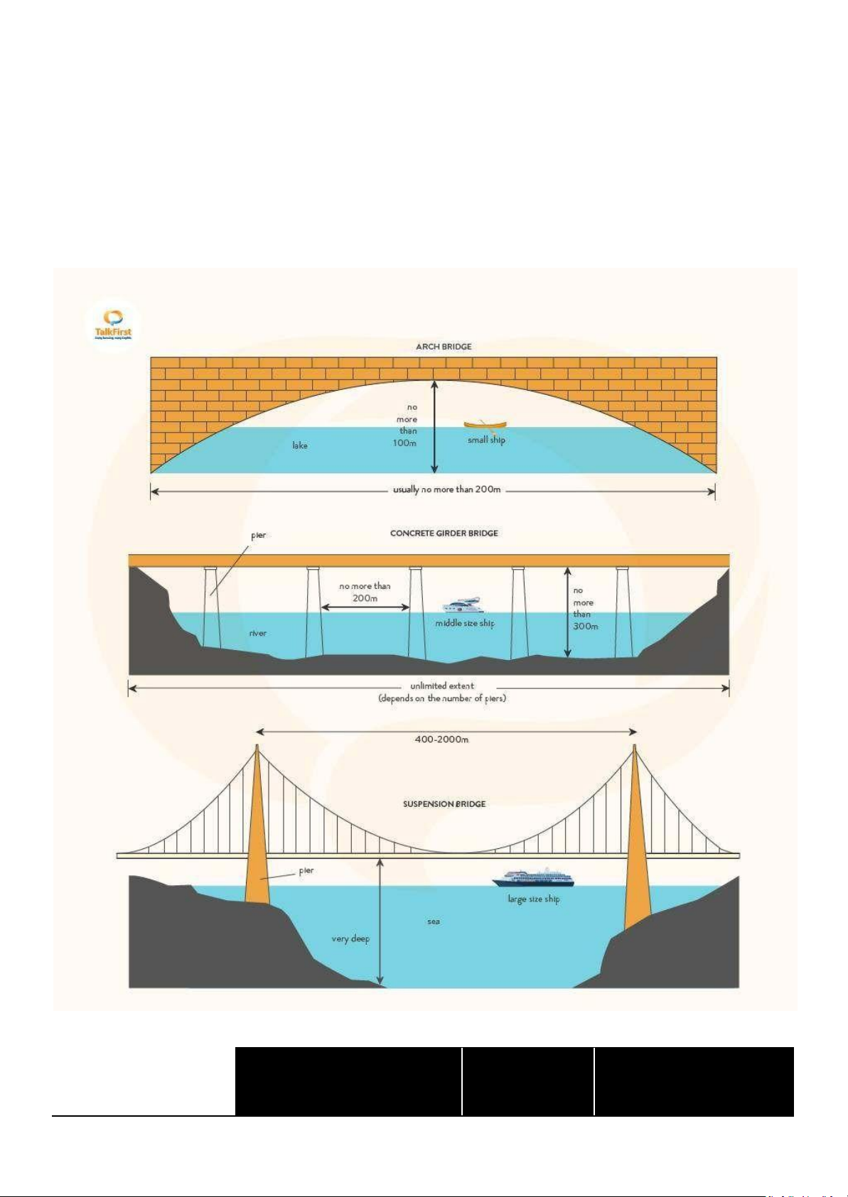 The diagram compares three types of bridges: Arch Bridge, Concrete Girdle Bridge, and Suspension Bridge, focusing on their