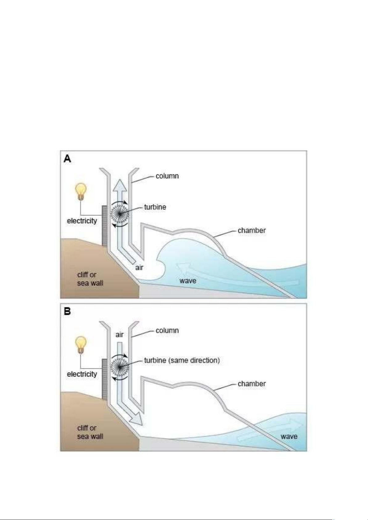 flow of power. The first diagram details how the rising wave forces air through the turbine, while the second diagram demonstrates