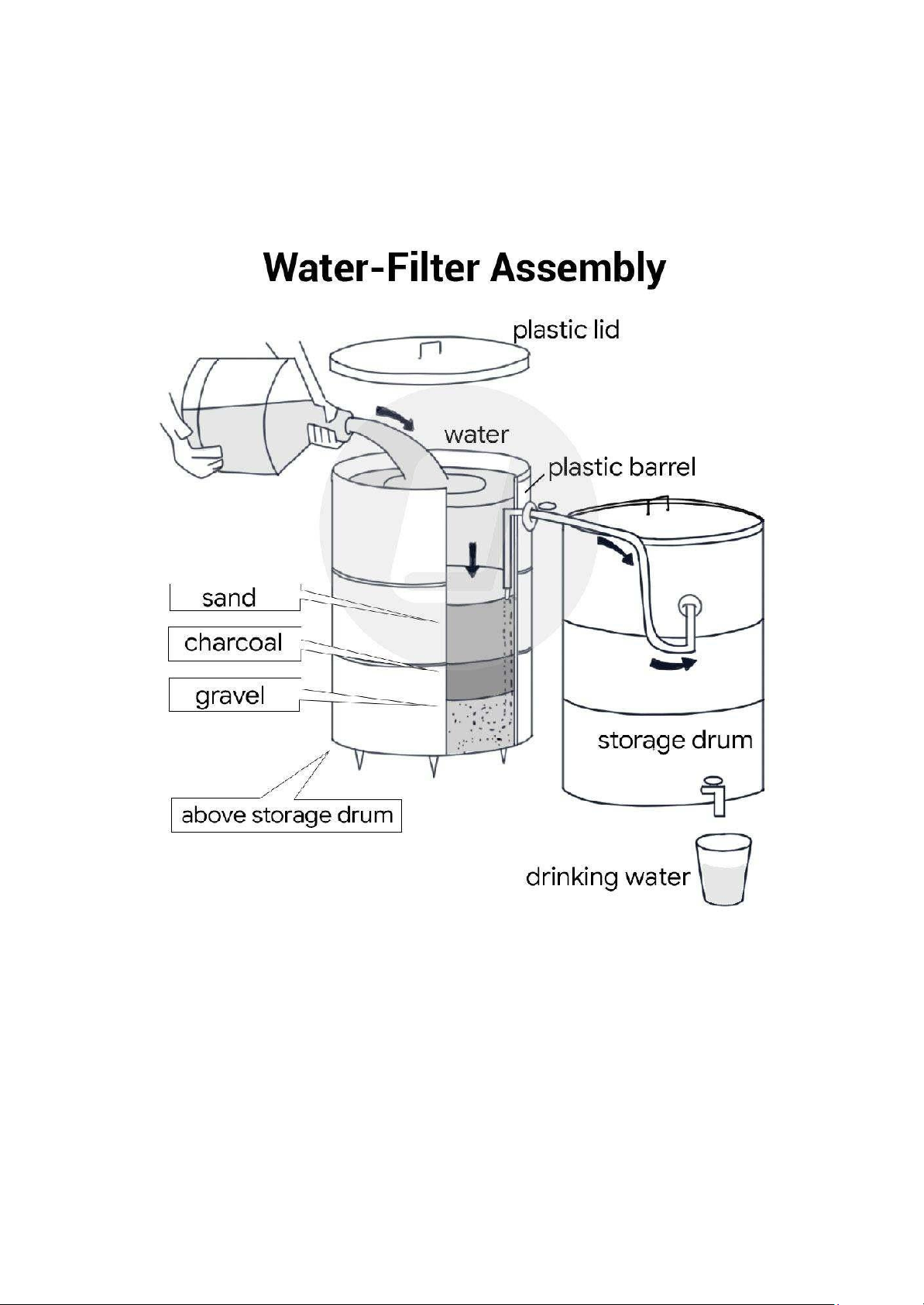 filter is constructed within the barrel by adding layers of sand, charcoal, and gravel. Lastly, a tap is installed at the bottom of the