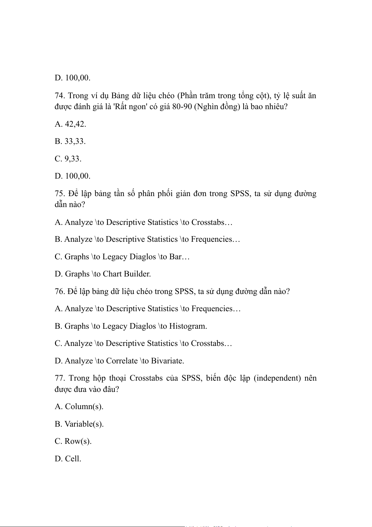 77. Trong hộp thoại Crosstabs của SPSS, biến độc lập (independent) nên được đưa vào đâu? A. Column(s). B. Variable(s). C. Row(s). D. Cell.