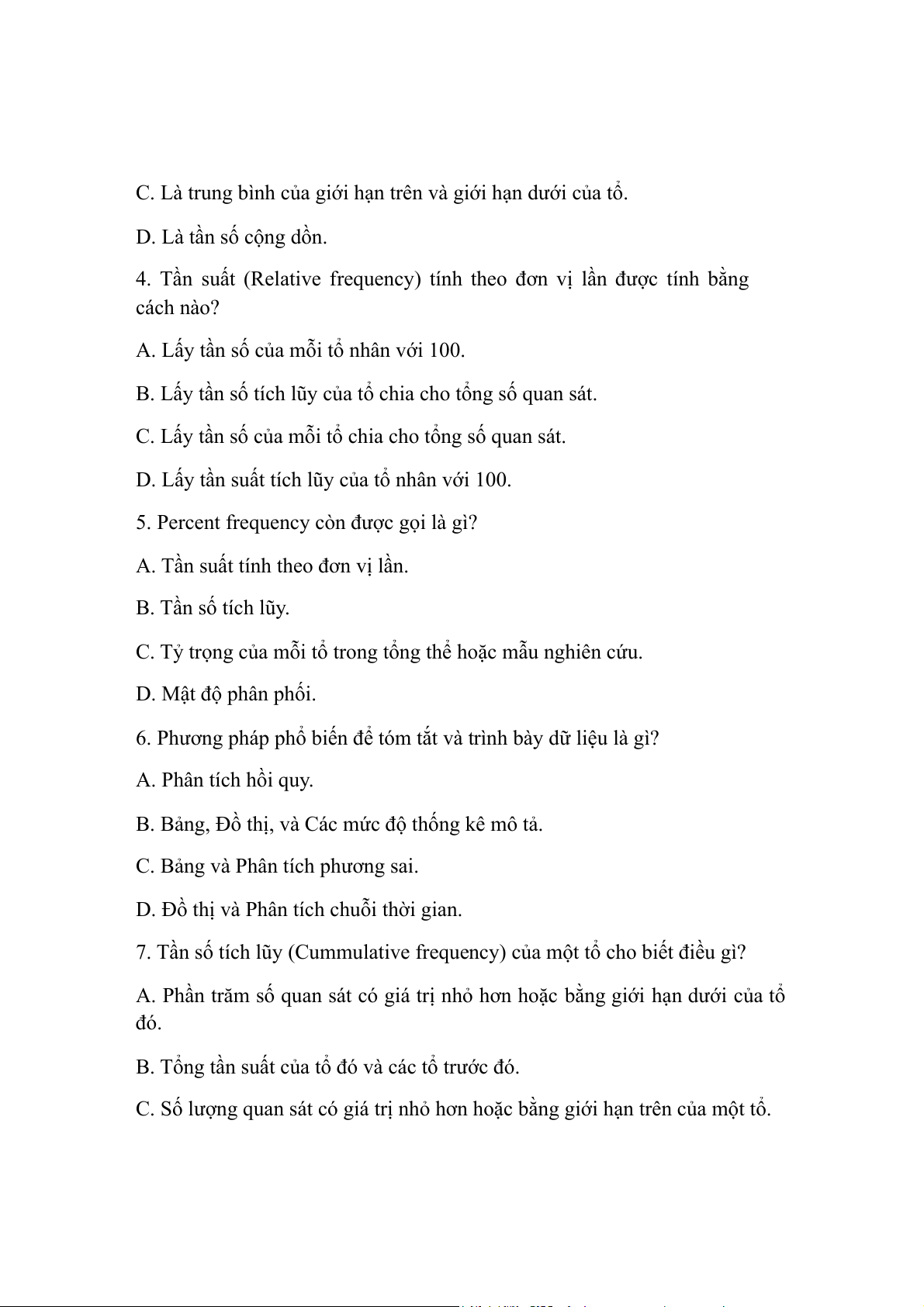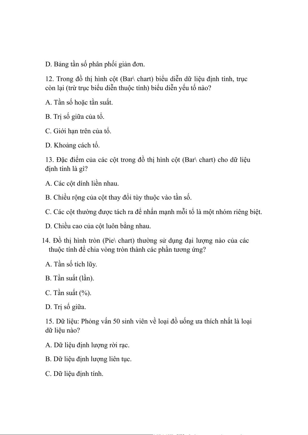 19. Đồ thị hình cột cho dữ liệu định tính sử dụng trục hoành để biểu diễn gì? A. Tần suất (%). B. Trị số giữa.