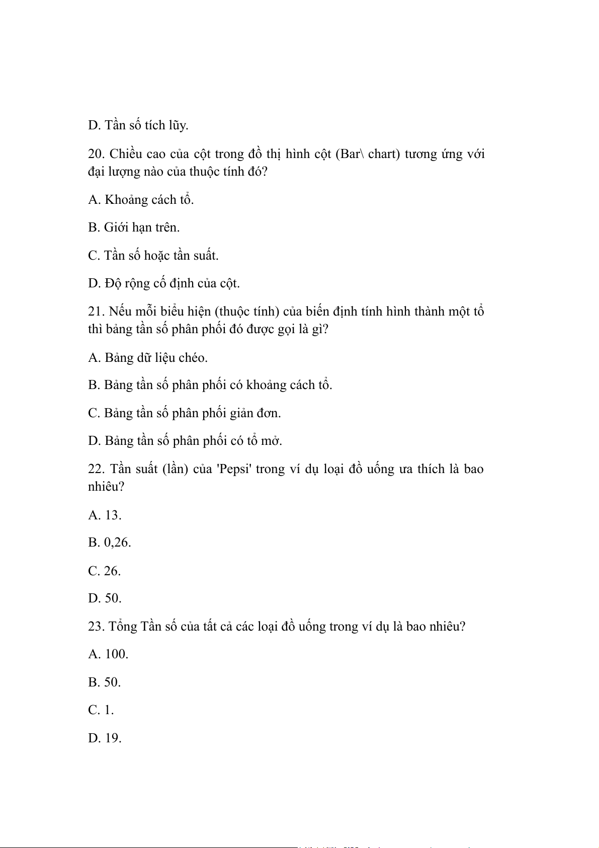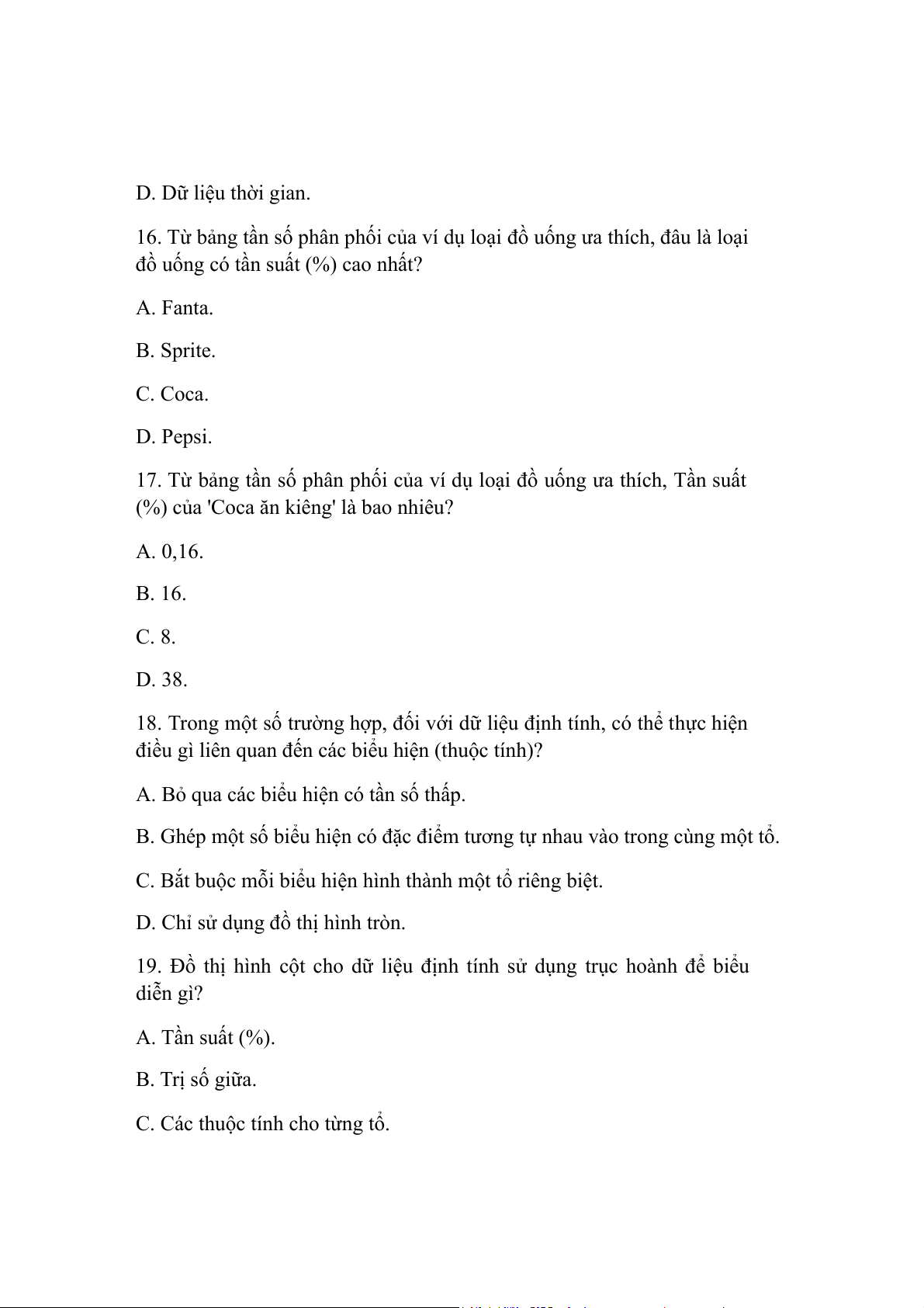 24. Loại đồ uống nào có Tần số bằng 8 trong ví dụ loại đồ uống ưa thích? A. Coca. B. Coca ăn kiêng. C. Fanta. D. Sprite.