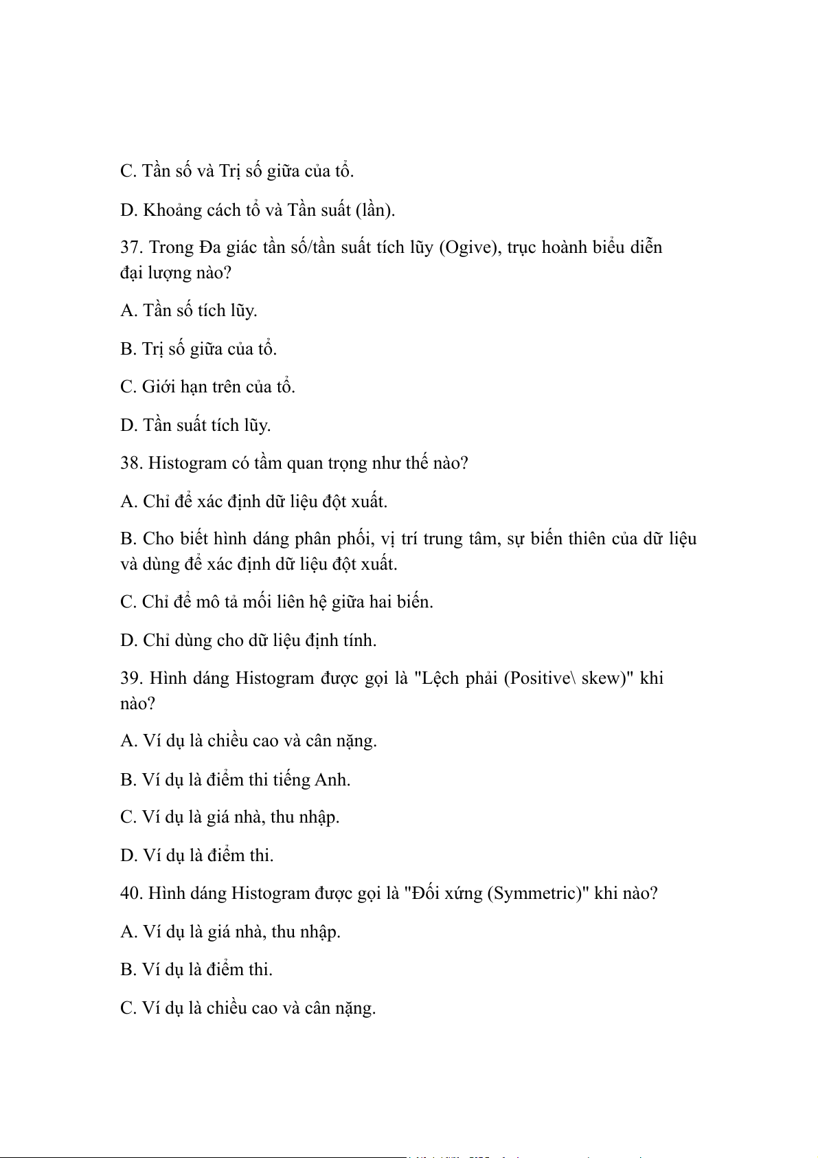 52. Hình dáng Histogram được gọi là "Hai mốt (Bimodal)" có ví dụ là gì? A. Giá nhà, thu nhập. B. Điểm thi tiếng Anh.