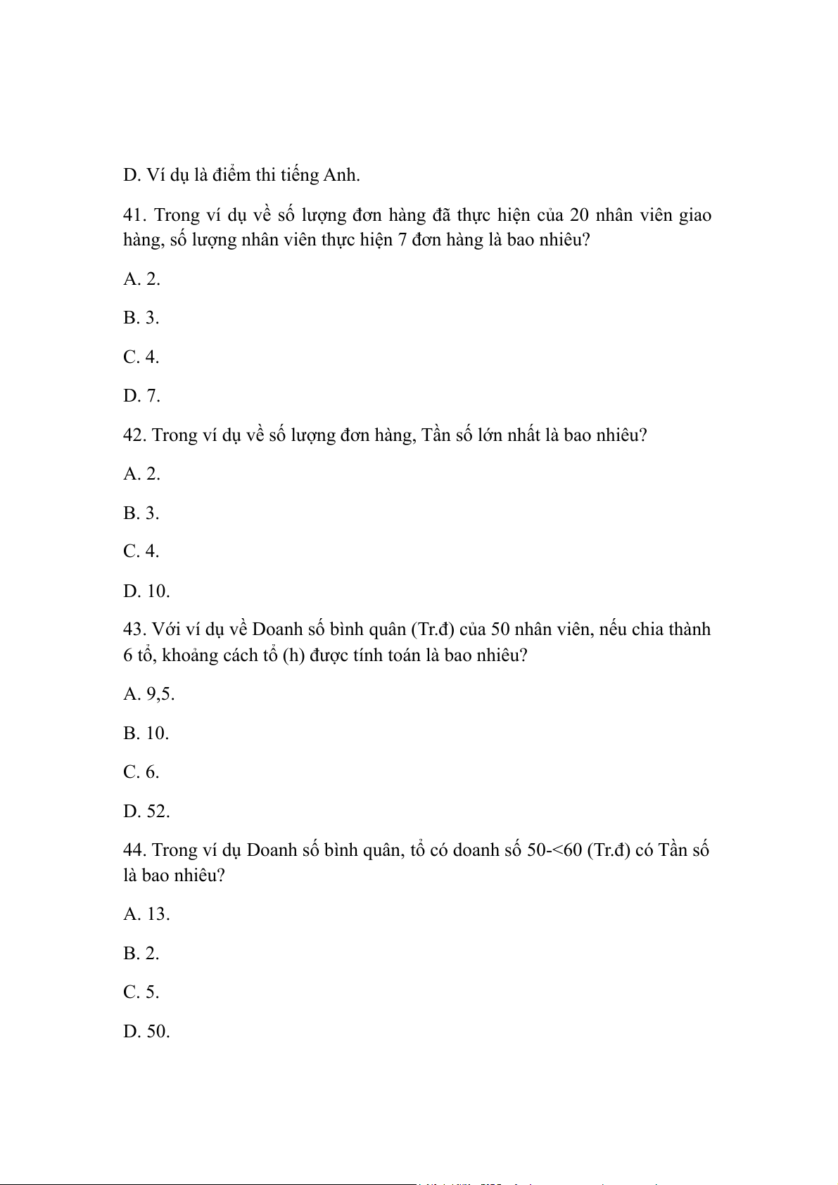 48. Tần suất (%) của tổ 100-110 trong ví dụ Doanh số bình quân là bao nhiêu? A. 5. B. 10. C. 50. D. 100.