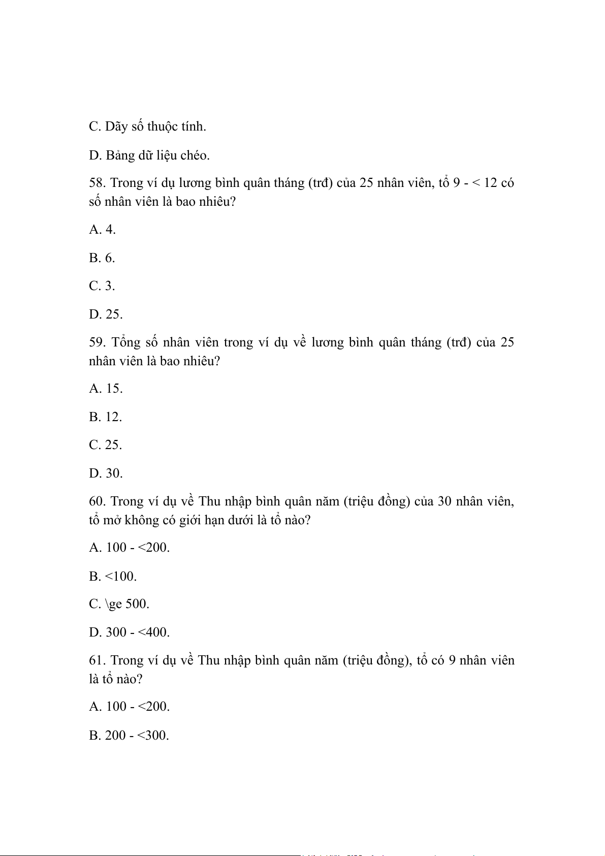 60. Trong ví dụ về Thu nhập bình quân năm (triệu đồng) của 30 nhân viên,