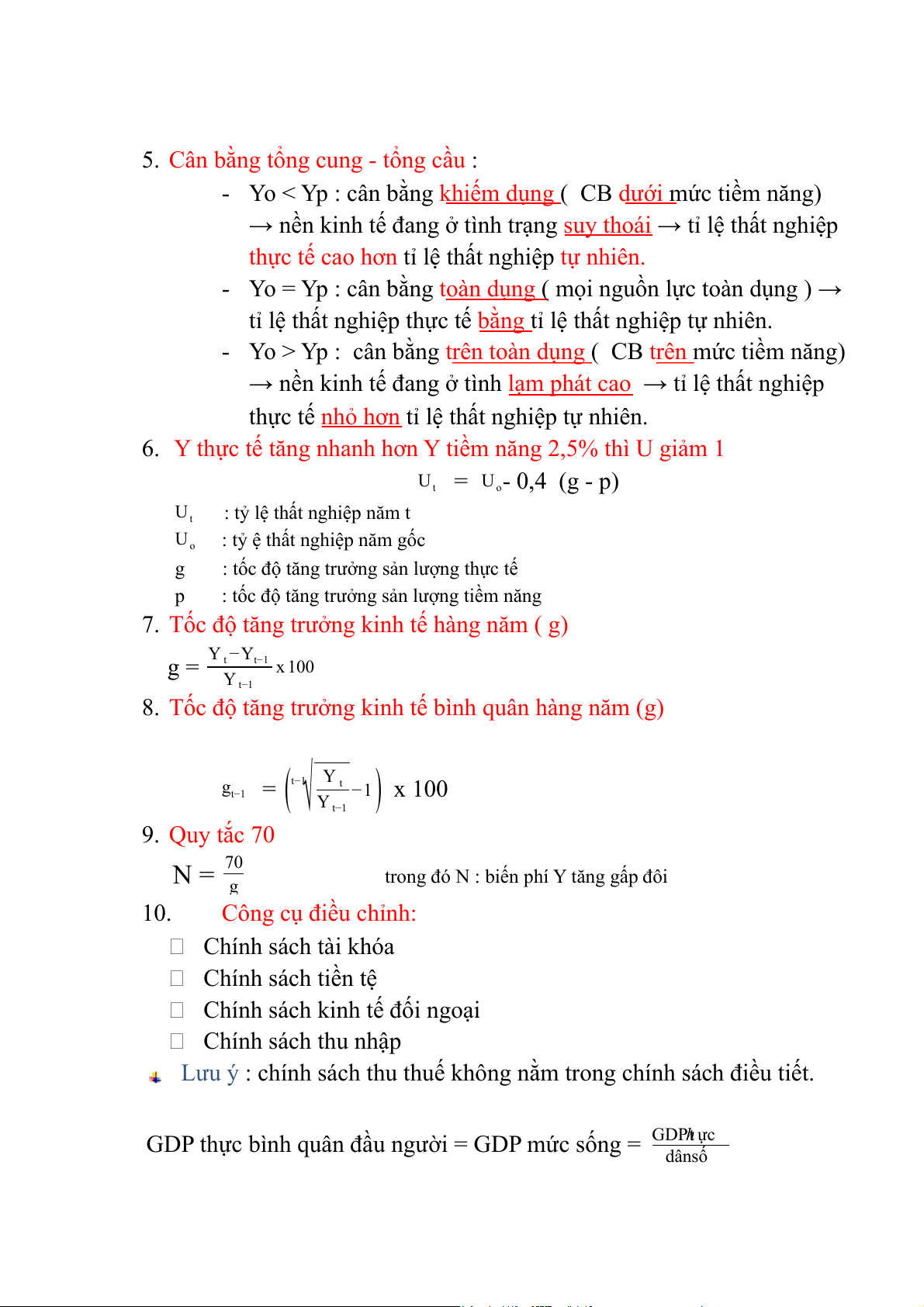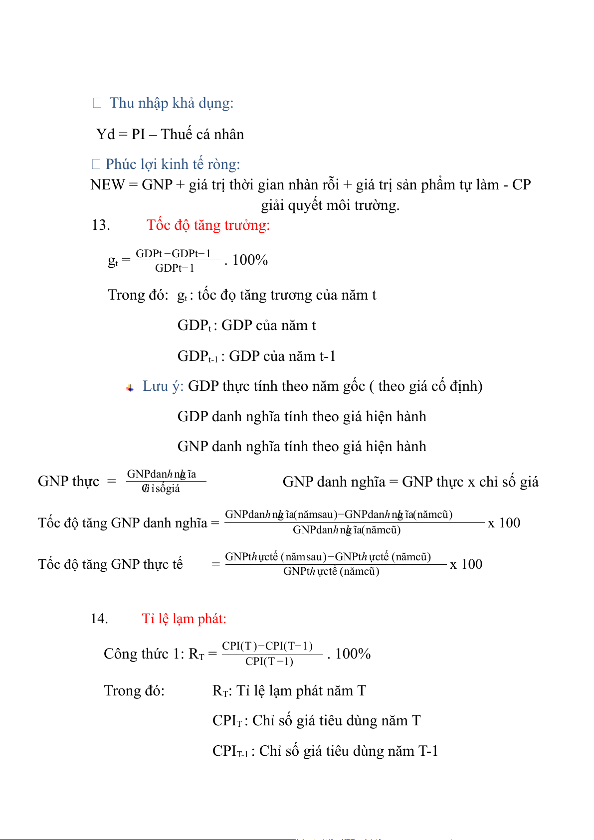 NEW = GNP + giá trị thời gian nhàn rỗi + giá trị sản phẩm tự làm - CP giải quyết môi trường. 13. Tốc độ tăng trưởng: gt = GDPt −GDPt−1 . 100% GDPt−1