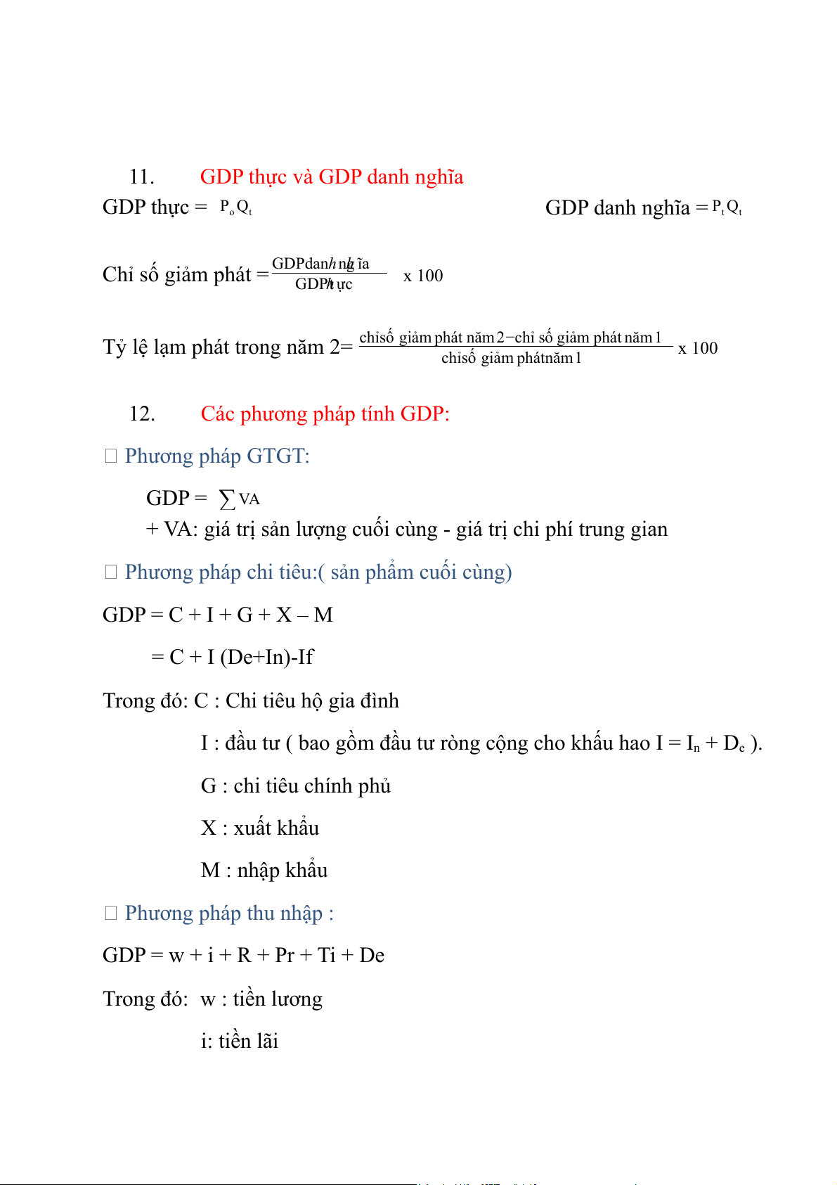 Tỷ lệ lạm phát trong năm 2= chỉsố giảm phát năm2−chỉ số giảm phát năm1 x 100 chỉsố giảm phátnăm1 12. Các phương pháp tính GDP: Phương pháp GTGT: GDP = ∑ VA