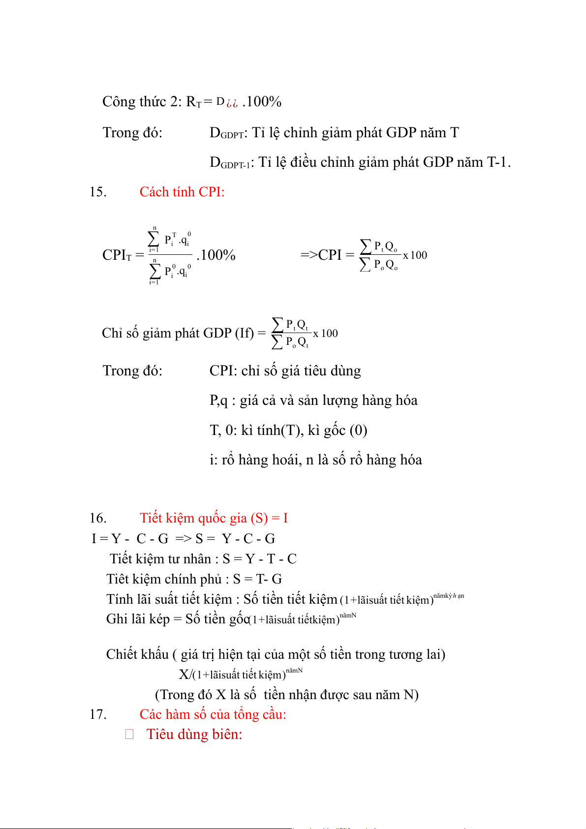 DGDPT-1: Tỉ lệ điều chỉnh giảm phát GDP năm T-1. 15. Cách tính CPI: n ∑ PT .q0 i i ∑ P Q CPI i=1 t o T = .100% =>CPI = x 100 n ∑ ∑ P Q P 0.q 0 o o i i i=1 ∑ P Q