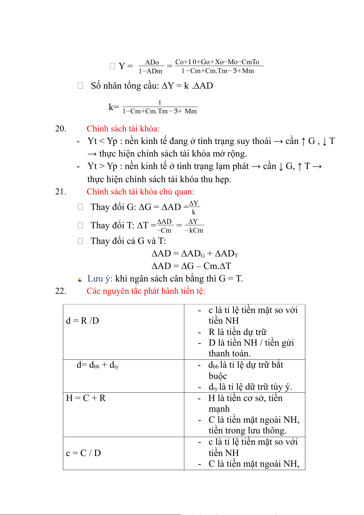 Số nhân tổng cầu: ∆Y = k .∆AD k= 1 1−Cm+Cm.Tm − ℑ+ Mm 20. Chính sách tài khóa: