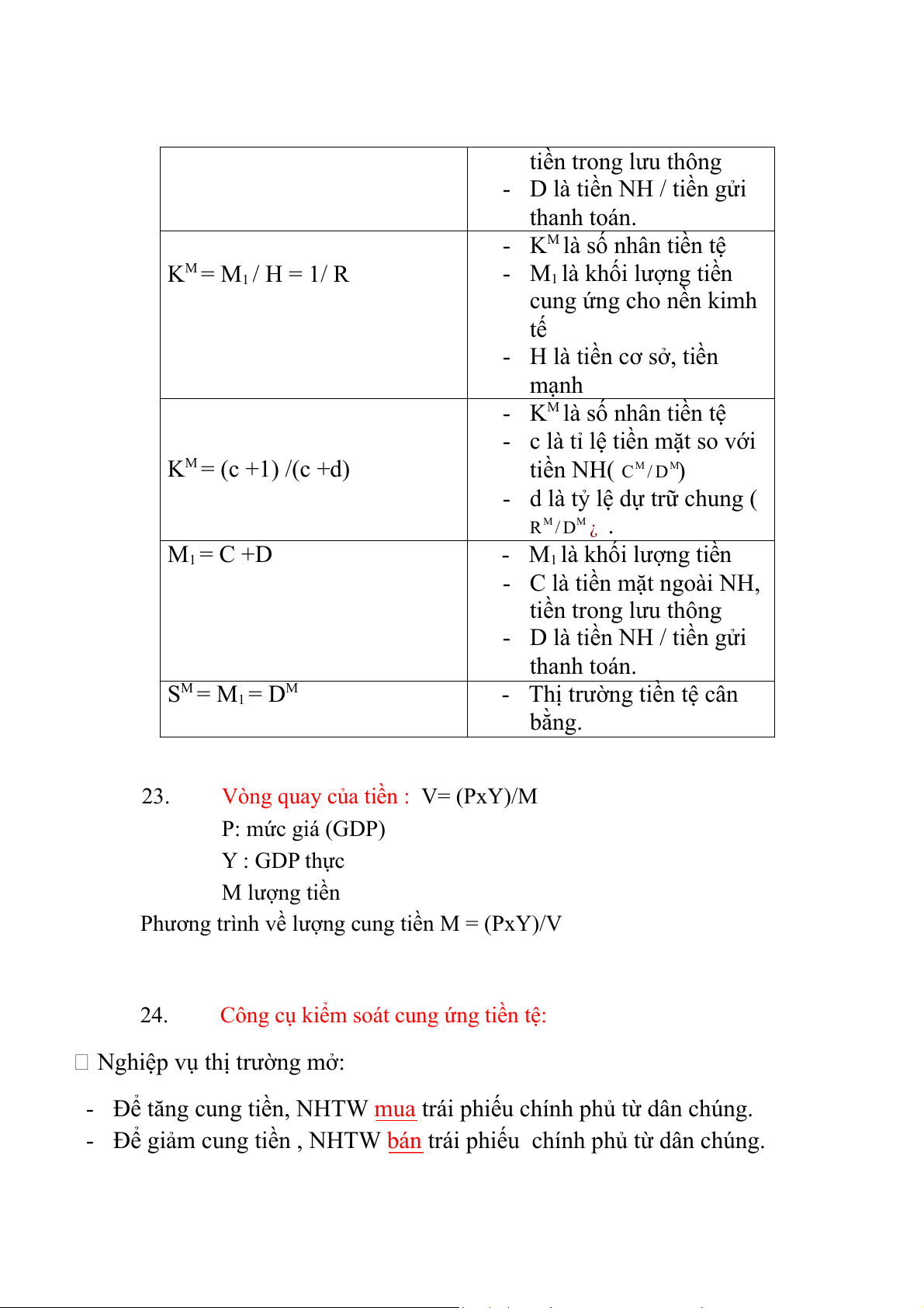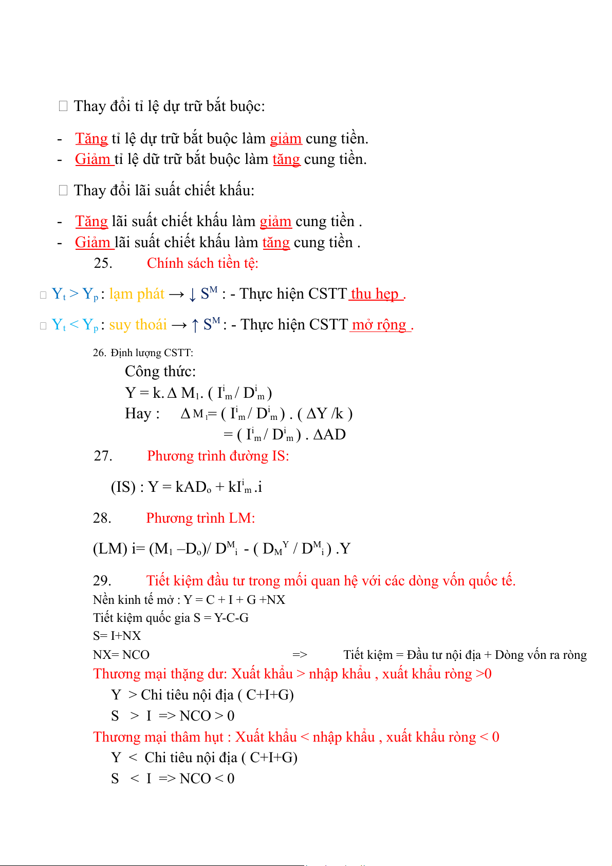 ↑ SM : - Thực hiện CSTT mở rộng . 26. Định lượng CSTT: Công thức: Y = k. i i ∆ M1. ( I m / D m ) Hay : ∆ M = ( Ii i m / D m ) . ( ∆Y /k ) 1 = ( Ii i m / D m ) . ∆AD 27. Phương trình đường IS: (IS) : Y = kAD i o + kI m .i 28. Phương trình LM: (LM) i= (M M Y M