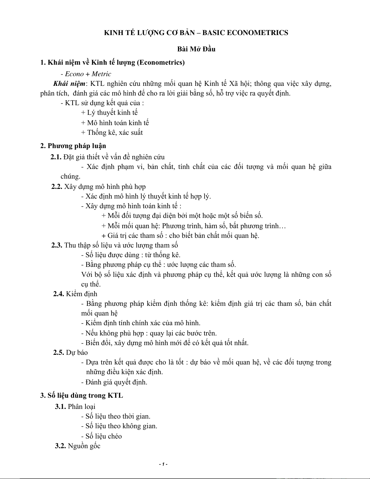 KINH TẾ LƢỢNG CƠ BẢN – BASIC ECONOMETRICS Bài Mở Đầu