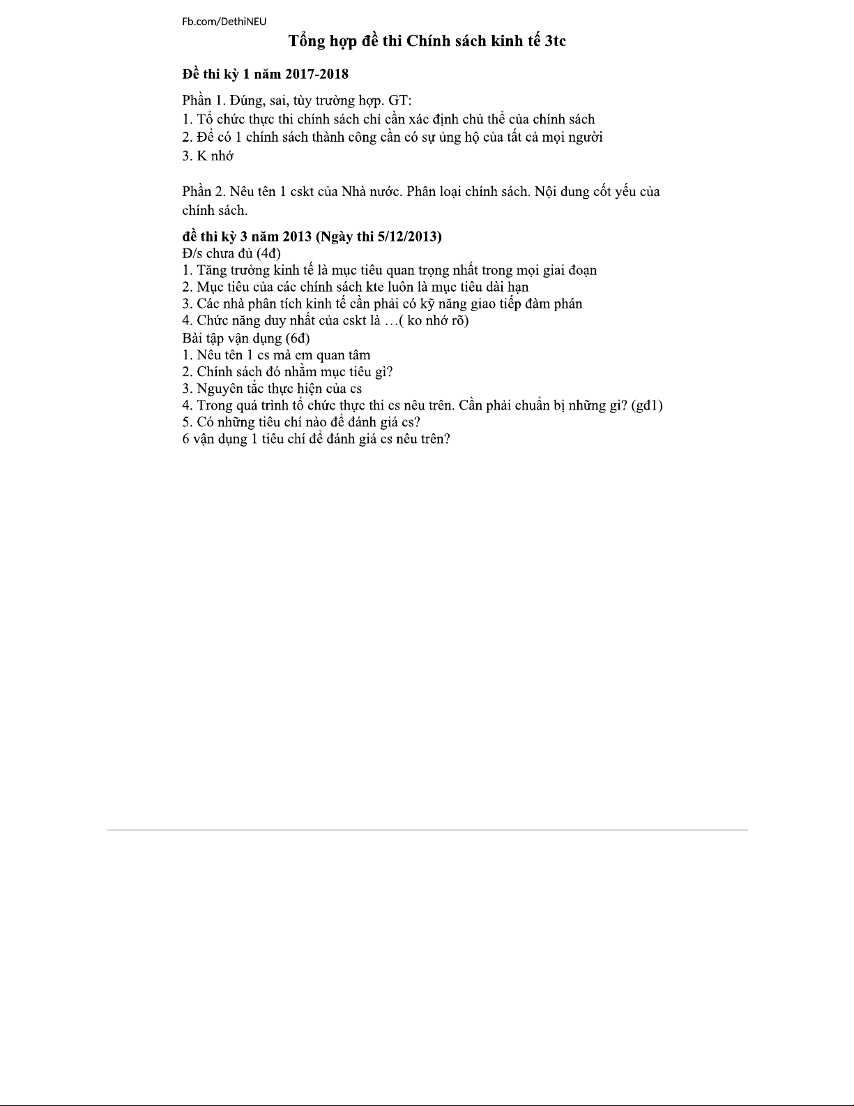 Tổng hợp Đề thi Chính sách Kinh tế 3TC - Năm 2017 & 2013