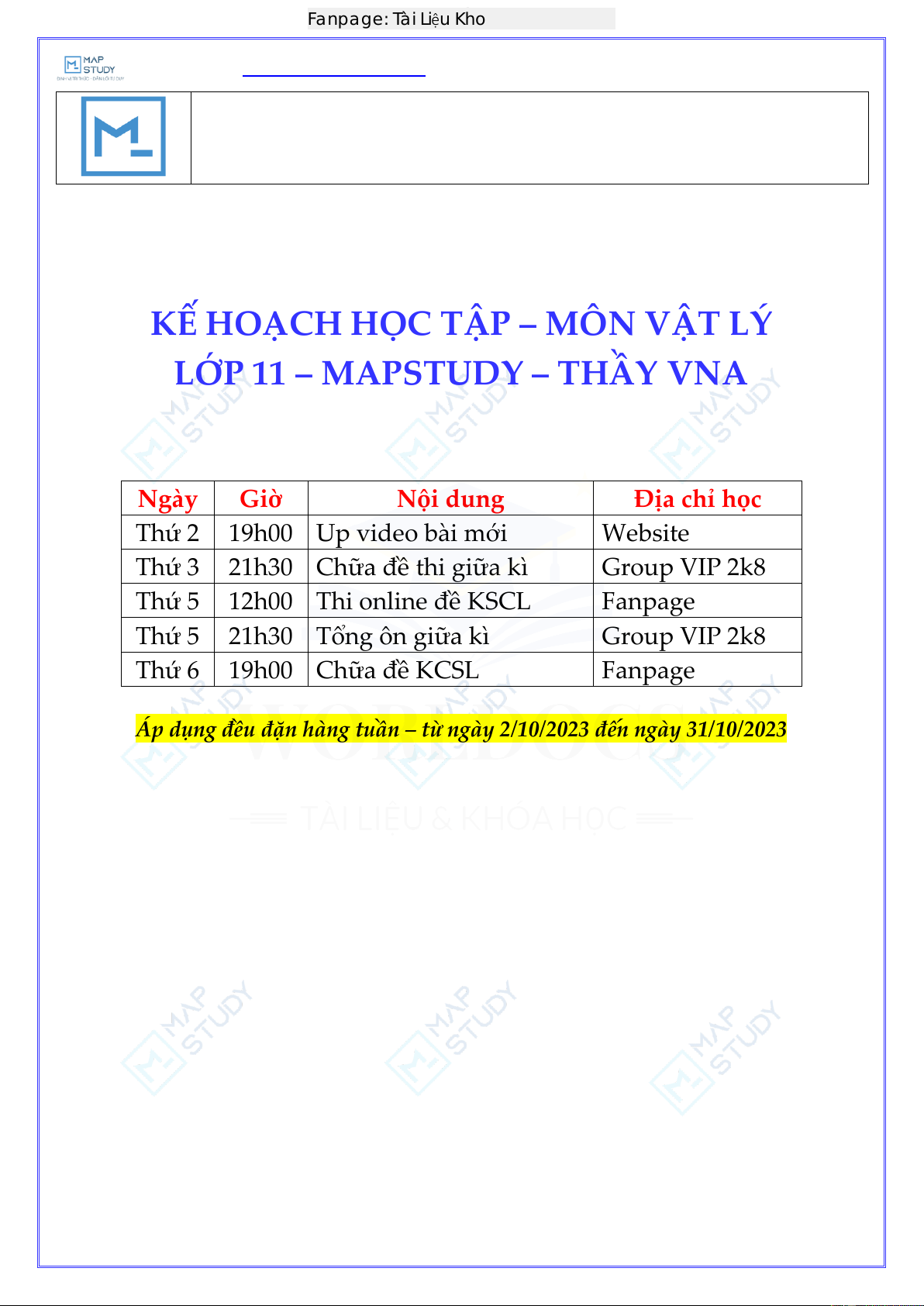LỚP 11 – MAPSTU DY – THẦY VNA Ngày Giờ Nội dung Địa chỉ học