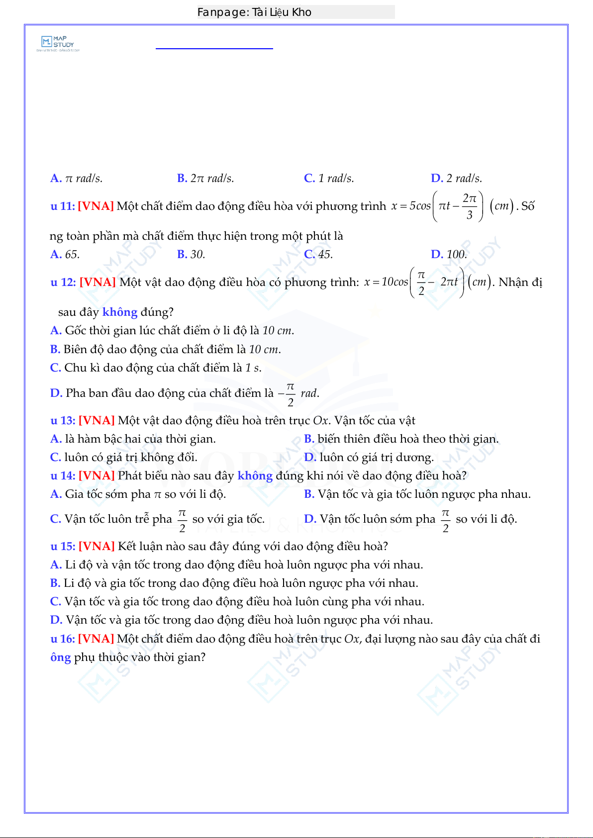 Câu 11: [VNA] Một chất điểm dao động điều hòa với phương trình x = 5cos πt –