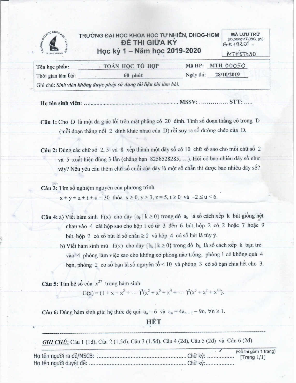 Đề thi giữa học kỳ 1 năm học 2019-2020 môn Toán học tổ hợp | Trường Đại học Khoa học tự nhiên, Đại học Quốc gia Thành phố Hồ Chí Minh