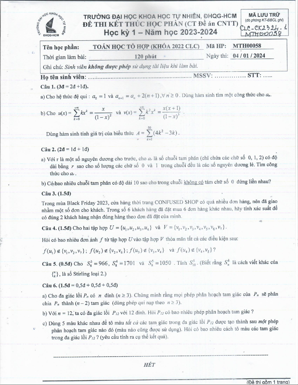 Đề thi giữa HKI học phần Toán học tổ hợp năm 2024 - 2025 | Trường Đại học Khoa học tự nhiên, Đại học Quốc gia Thành phố Hồ Chí Minh