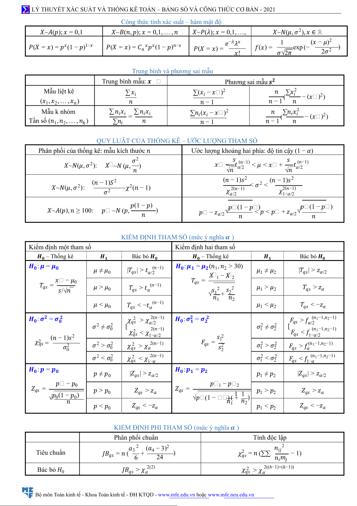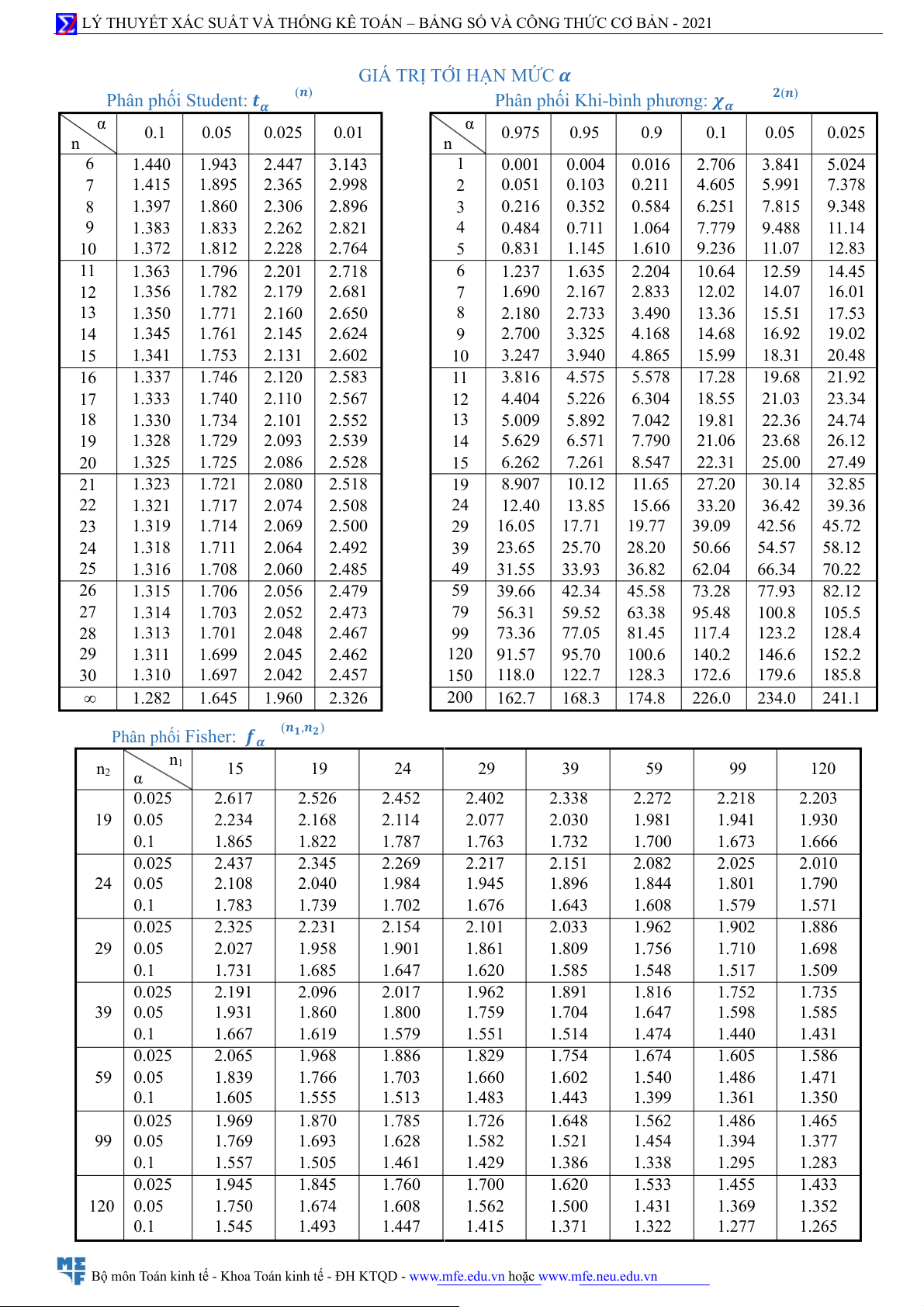 LÝ THUYẾT XÁC SUẤT VÀ THỐNG KÊ TOÁN – BẢNG SỐ VÀ CÔNG THỨC CƠ BẢN - 2021