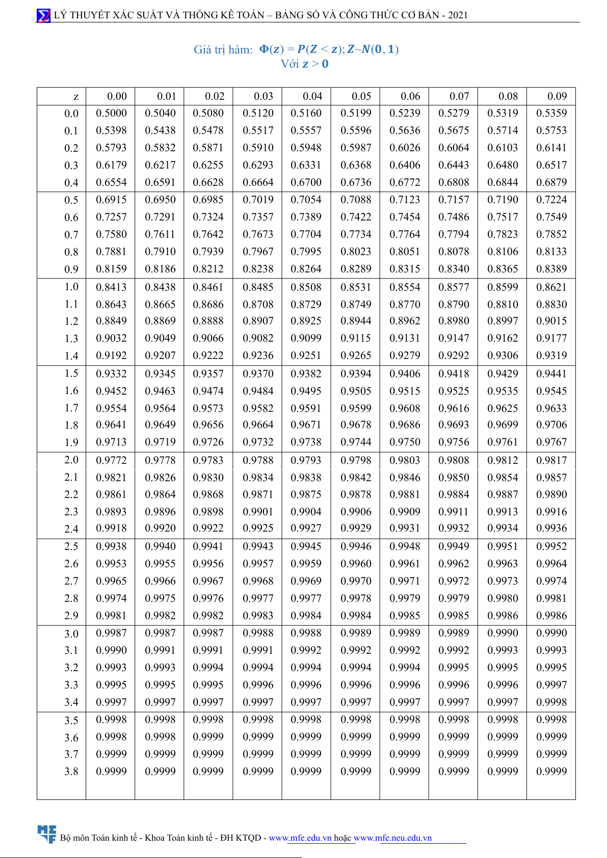 Giá trị hàm: 𝚽(𝒛) = 𝑷(𝒁 < 𝒛); 𝒁~𝑵(𝟎, 𝟏) Với 𝒛 > 𝟎 z 0.00 0.01 0.02 0.03 0.04 0.05 0.06 0.07 0.08 0.09 0.0 0.5000 0.5040 0.5080 0.5120 0.5160 0.5199 0.5239 0.5279 0.5319 0.5359 0.1 0.5398 0.5438 0.5478 0.5517 0.5557 0.5596 0.5636 0.5675 0.5714 0.5753 0.2 0.5793 0.5832 0.5871 0.5910 0.5948 0.5987 0.6026 0.6064 0.6103 0.6141 0.3 0.6179 0.6217 0.6255 0.6293 0.6331 0.6368 0.6406 0.6443 0.6480 0.6517 0.4 0.6554 0.6591 0.6628 0.6664 0.6700 0.6736 0.6772 0.6808 0.6844 0.6879 0.5 0.6915 0.6950 0.6985 0.7019 0.7054 0.7088 0.7123 0.7157 0.7190 0.7224 0.6 0.7257 0.7291 0.7324 0.7357 0.7389 0.7422 0.7454 0.7486 0.7517 0.7549 0.7 0.7580 0.7611 0.7642 0.7673 0.7704 0.7734 0.7764 0.7794 0.7823 0.7852 0.8 0.7881 0.7910 0.7939 0.7967 0.7995 0.8023 0.8051 0.8078 0.8106 0.8133 0.9 0.8159 0.8186 0.8212 0.8238 0.8264 0.8289 0.8315 0.8340 0.8365 0.8389 1.0 0.8413 0.8438 0.8461 0.8485 0.8508 0.8531 0.8554 0.8577 0.8599 0.8621 1.1 0.8643 0.8665 0.8686 0.8708 0.8729 0.8749 0.8770 0.8790 0.8810 0.8830 1.2 0.8849 0.8869 0.8888 0.8907 0.8925 0.8944 0.8962 0.8980 0.8997 0.9015 1.3 0.9032 0.9049 0.9066 0.9082 0.9099 0.9115 0.9131 0.9147 0.9162 0.9177 1.4 0.9192 0.9207 0.9222 0.9236 0.9251 0.9265 0.9279 0.9292 0.9306 0.9319 1.5 0.9332 0.9345 0.9357 0.9370 0.9382 0.9394 0.9406 0.9418 0.9429 0.9441 1.6 0.9452 0.9463 0.9474 0.9484 0.9495 0.9505 0.9515 0.9525 0.9535 0.9545 1.7 0.9554 0.9564 0.9573 0.9582 0.9591 0.9599 0.9608 0.9616 0.9625 0.9633 1.8 0.9641 0.9649 0.9656 0.9664 0.9671 0.9678 0.9686 0.9693 0.9699 0.9706 1.9 0.9713 0.9719 0.9726 0.9732 0.9738 0.9744 0.9750 0.9756 0.9761 0.9767 2.0 0.9772 0.9778 0.9783 0.9788 0.9793 0.9798 0.9803 0.9808 0.9812 0.9817 2.1 0.9821 0.9826 0.9830 0.9834 0.9838 0.9842 0.9846 0.9850 0.9854 0.9857 2.2 0.9861 0.9864 0.9868 0.9871 0.9875 0.9878 0.9881 0.9884 0.9887 0.9890 2.3 0.9893 0.9896 0.9898 0.9901 0.9904 0.9906 0.9909 0.9911 0.9913 0.9916 2.4 0.9918 0.9920 0.9922 0.9925 0.9927 0.9929 0.9931 0.9932 0.9934 0.9936 2.5 0.9938 0.9940 0.9941 0.9943 0.9945 0.9946 0.9948 0.9949 0.9951 0.9952 2.6 0.9953 0.9955 0.9956 0.9957 0.9959 0.9960 0.9961 0.9962 0.9963 0.9964 2.7 0.9965 0.9966 0.9967 0.9968 0.9969 0.9970 0.9971 0.9972 0.9973 0.9974 2.8 0.9974 0.9975 0.9976 0.9977 0.9977 0.9978 0.9979 0.9979 0.9980 0.9981 2.9 0.9981 0.9982 0.9982 0.9983 0.9984 0.9984 0.9985 0.9985 0.9986 0.9986 3.0 0.9987 0.9987 0.9987 0.9988 0.9988 0.9989 0.9989 0.9989 0.9990 0.9990 3.1 0.9990 0.9991 0.9991 0.9991 0.9992 0.9992 0.9992 0.9992 0.9993 0.9993 3.2 0.9993 0.9993 0.9994 0.9994 0.9994 0.9994 0.9994 0.9995 0.9995 0.9995 3.3 0.9995 0.9995 0.9995 0.9996 0.9996 0.9996 0.9996 0.9996 0.9996 0.9997 3.4 0.9997 0.9997 0.9997 0.9997 0.9997 0.9997 0.9997 0.9997 0.9997 0.9998 3.5 0.9998 0.9998 0.9998 0.9998 0.9998 0.9998 0.9998 0.9998 0.9998 0.9998 3.6 0.9998 0.9998 0.9999 0.9999 0.9999 0.9999 0.9999 0.9999 0.9999 0.9999 3.7 0.9999 0.9999 0.9999 0.9999 0.9999 0.9999 0.9999 0.9999 0.9999 0.9999 3.8 0.9999 0.9999 0.9999 0.9999 0.9999 0.9999 0.9999 0.9999 0.9999 0.9999