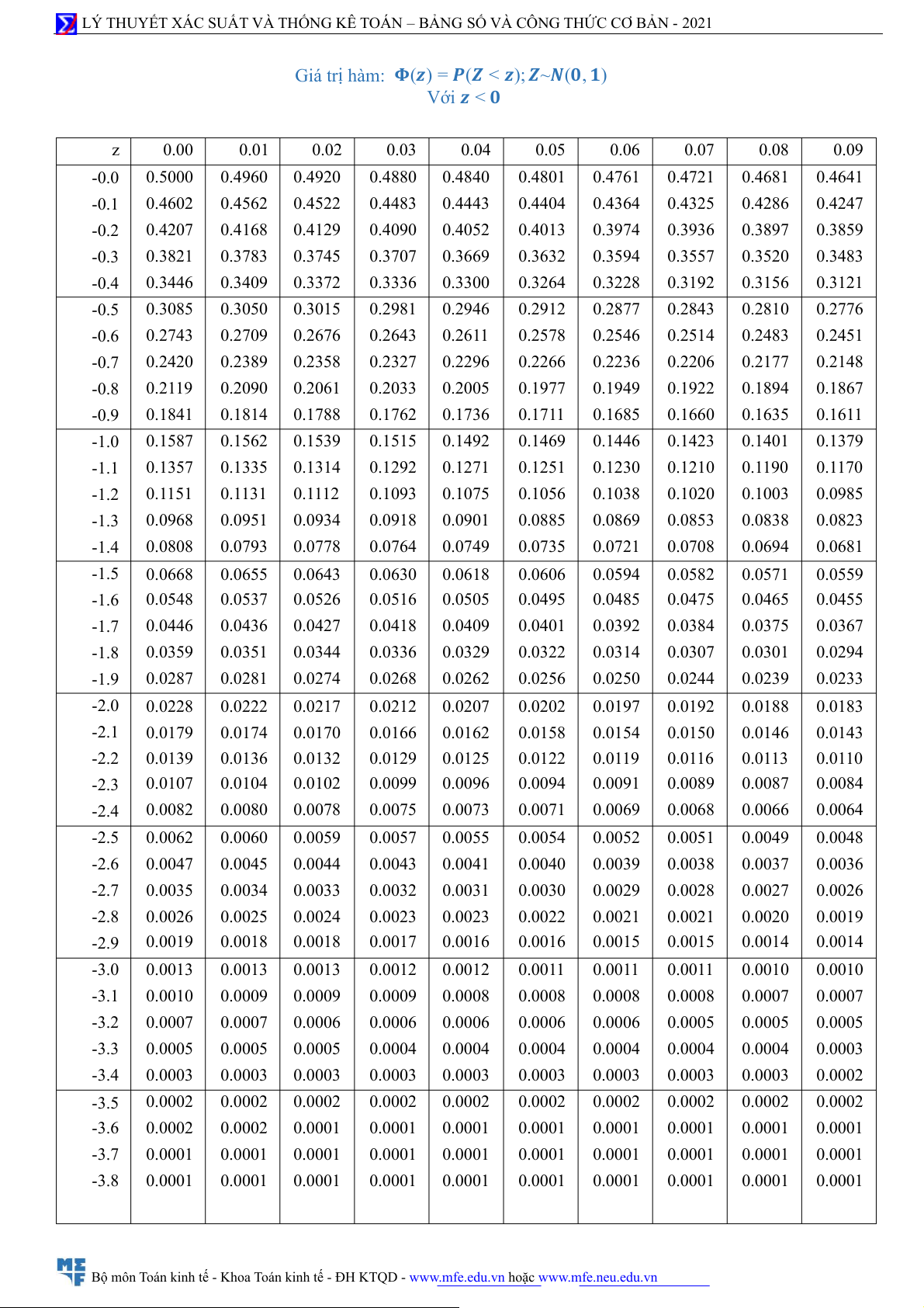 Giá trị hàm: 𝚽(𝒛) = 𝑷(𝒁 < 𝒛); 𝒁~𝑵(𝟎, 𝟏) Với 𝒛 < 𝟎 z 0.00 0.01 0.02 0.03 0.04 0.05 0.06 0.07 0.08 0.09 -0.0 0.5000 0.4960 0.4920 0.4880 0.4840 0.4801 0.4761 0.4721 0.4681 0.4641 -0.1 0.4602 0.4562 0.4522 0.4483 0.4443 0.4404 0.4364 0.4325 0.4286 0.4247 -0.2 0.4207 0.4168 0.4129 0.4090 0.4052 0.4013 0.3974 0.3936 0.3897 0.3859 -0.3 0.3821 0.3783 0.3745 0.3707 0.3669 0.3632 0.3594 0.3557 0.3520 0.3483 -0.4 0.3446 0.3409 0.3372 0.3336 0.3300 0.3264 0.3228 0.3192 0.3156 0.3121 -0.5 0.3085 0.3050 0.3015 0.2981 0.2946 0.2912 0.2877 0.2843 0.2810 0.2776 -0.6 0.2743 0.2709 0.2676 0.2643 0.2611 0.2578 0.2546 0.2514 0.2483 0.2451 -0.7 0.2420 0.2389 0.2358 0.2327 0.2296 0.2266 0.2236 0.2206 0.2177 0.2148 -0.8 0.2119 0.2090 0.2061 0.2033 0.2005 0.1977 0.1949 0.1922 0.1894 0.1867 -0.9 0.1841 0.1814 0.1788 0.1762 0.1736 0.1711 0.1685 0.1660 0.1635 0.1611 -1.0 0.1587 0.1562 0.1539 0.1515 0.1492 0.1469 0.1446 0.1423 0.1401 0.1379 -1.1 0.1357 0.1335 0.1314 0.1292 0.1271 0.1251 0.1230 0.1210 0.1190 0.1170 -1.2 0.1151 0.1131 0.1112 0.1093 0.1075 0.1056 0.1038 0.1020 0.1003 0.0985 -1.3 0.0968 0.0951 0.0934 0.0918 0.0901 0.0885 0.0869 0.0853 0.0838 0.0823 -1.4 0.0808 0.0793 0.0778 0.0764 0.0749 0.0735 0.0721 0.0708 0.0694 0.0681 -1.5 0.0668 0.0655 0.0643 0.0630 0.0618 0.0606 0.0594 0.0582 0.0571 0.0559 -1.6 0.0548 0.0537 0.0526 0.0516 0.0505 0.0495 0.0485 0.0475 0.0465 0.0455 -1.7 0.0446 0.0436 0.0427 0.0418 0.0409 0.0401 0.0392 0.0384 0.0375 0.0367 -1.8 0.0359 0.0351 0.0344 0.0336 0.0329 0.0322 0.0314 0.0307 0.0301 0.0294 -1.9 0.0287 0.0281 0.0274 0.0268 0.0262 0.0256 0.0250 0.0244 0.0239 0.0233 -2.0 0.0228 0.0222 0.0217 0.0212 0.0207 0.0202 0.0197 0.0192 0.0188 0.0183 -2.1 0.0179 0.0174 0.0170 0.0166 0.0162 0.0158 0.0154 0.0150 0.0146 0.0143 -2.2 0.0139 0.0136 0.0132 0.0129 0.0125 0.0122 0.0119 0.0116 0.0113 0.0110 -2.3 0.0107 0.0104 0.0102 0.0099 0.0096 0.0094 0.0091 0.0089 0.0087 0.0084 -2.4 0.0082 0.0080 0.0078 0.0075 0.0073 0.0071 0.0069 0.0068 0.0066 0.0064 -2.5 0.0062 0.0060 0.0059 0.0057 0.0055 0.0054 0.0052 0.0051 0.0049 0.0048 -2.6 0.0047 0.0045 0.0044 0.0043 0.0041 0.0040 0.0039 0.0038 0.0037 0.0036 -2.7 0.0035 0.0034 0.0033 0.0032 0.0031 0.0030 0.0029 0.0028 0.0027 0.0026 -2.8 0.0026 0.0025 0.0024 0.0023 0.0023 0.0022 0.0021 0.0021 0.0020 0.0019 -2.9 0.0019 0.0018 0.0018 0.0017 0.0016 0.0016 0.0015 0.0015 0.0014 0.0014 -3.0 0.0013 0.0013 0.0013 0.0012 0.0012 0.0011 0.0011 0.0011 0.0010 0.0010 -3.1 0.0010 0.0009 0.0009 0.0009 0.0008 0.0008 0.0008 0.0008 0.0007 0.0007 -3.2 0.0007 0.0007 0.0006 0.0006 0.0006 0.0006 0.0006 0.0005 0.0005 0.0005 -3.3 0.0005 0.0005 0.0005 0.0004 0.0004 0.0004 0.0004 0.0004 0.0004 0.0003 -3.4 0.0003 0.0003 0.0003 0.0003 0.0003 0.0003 0.0003 0.0003 0.0003 0.0002 -3.5 0.0002 0.0002 0.0002 0.0002 0.0002 0.0002 0.0002 0.0002 0.0002 0.0002 -3.6 0.0002 0.0002 0.0001 0.0001 0.0001 0.0001 0.0001 0.0001 0.0001 0.0001 -3.7 0.0001 0.0001 0.0001 0.0001 0.0001 0.0001 0.0001 0.0001 0.0001 0.0001 -3.8 0.0001 0.0001 0.0001 0.0001 0.0001 0.0001 0.0001 0.0001 0.0001 0.0001