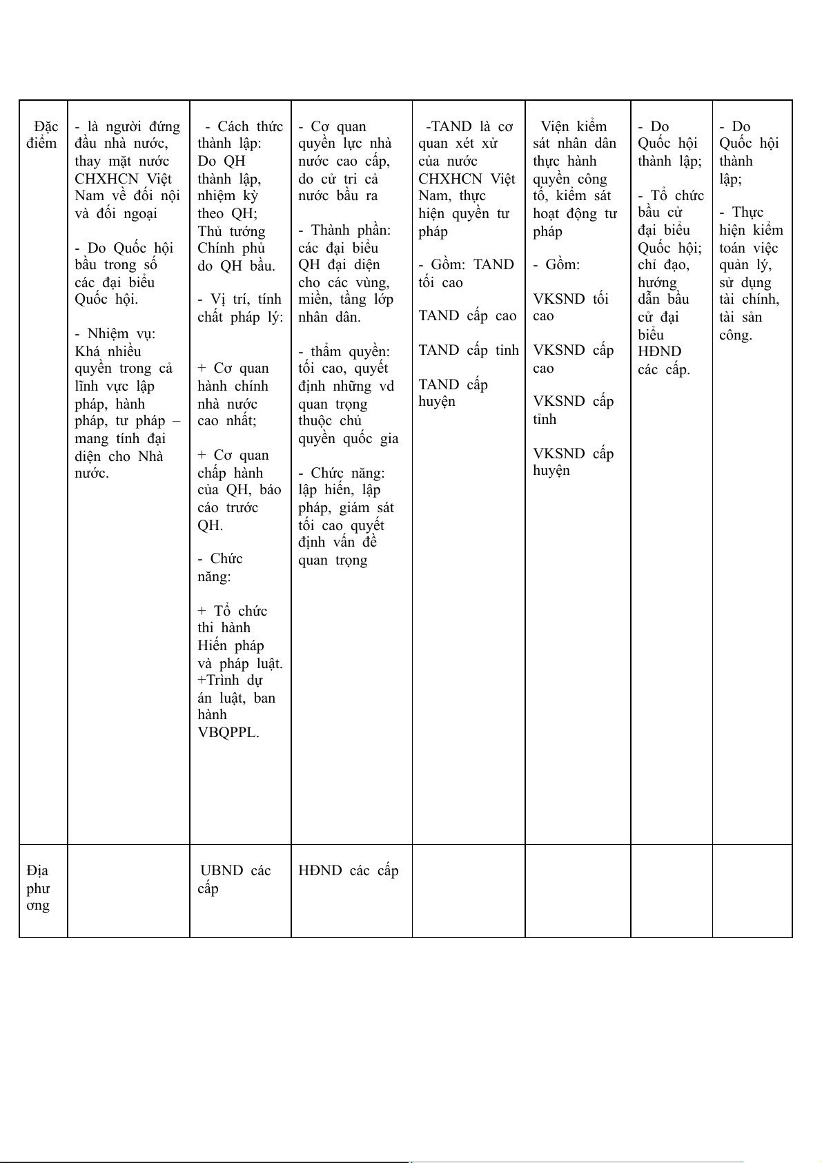 TAND cấp tỉnh VKSND cấp HĐND quyền trong cả + Cơ quan tối cao, quyết cao các cấp. lĩnh vực lập hành chính định những vd TAND cấp pháp, hành nhà nước quan trọng huyện VKSND cấp pháp, tư pháp – cao nhất; thuộc chủ tỉnh mang tính đại quyền quốc gia diện cho Nhà + Cơ quan VKSND cấp nước. chấp hành - Chức năng: huyện của QH, báo lập hiến, lập cáo trước pháp, giám sát QH. tối cao quyết định vấn đề - Chức quan trọng năng: + Tổ chức thi hành Hiến pháp và pháp luật. +Trình dự án luật, ban hành VBQPPL. Địa UBND các HĐND các cấp phư cấp ơng Đặc - Do HĐND - Cách thức điểm cùng cấp thành lập: Do bầu ra. cử tri địa phương trực