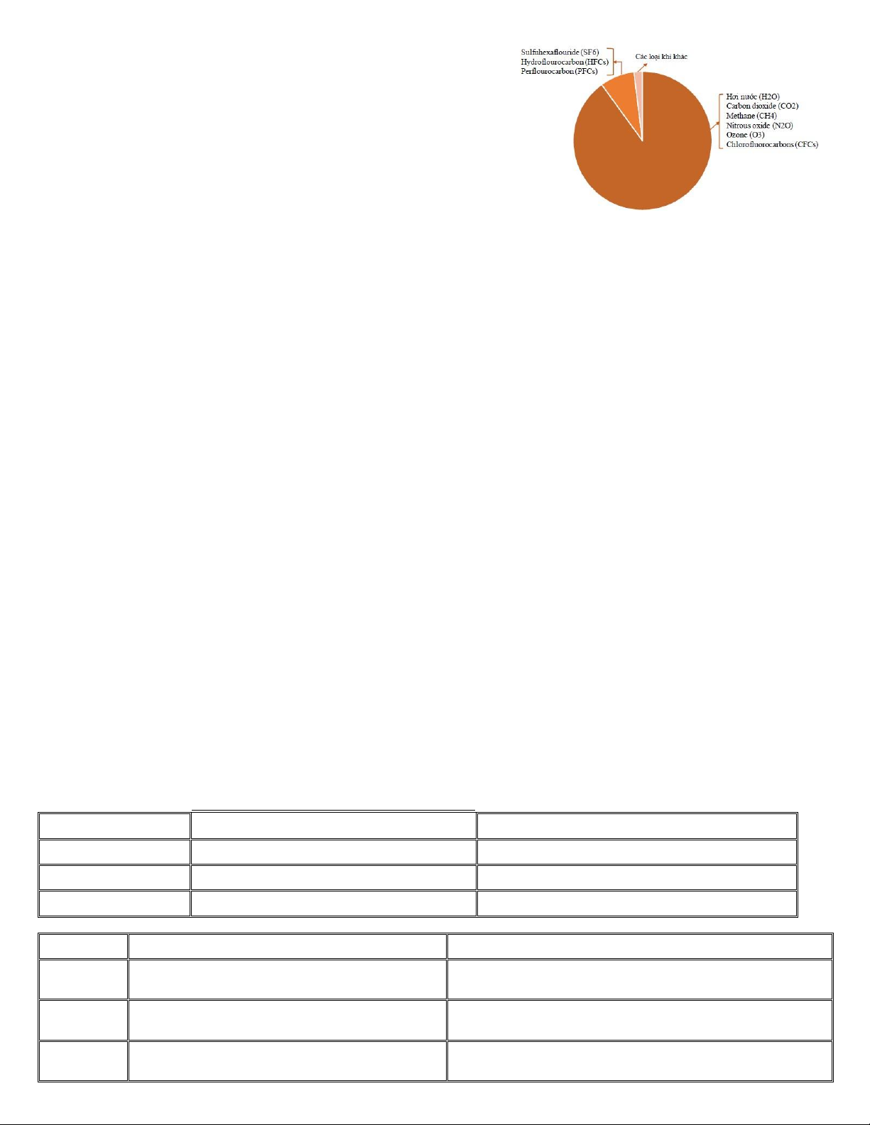 Dưới đây là các khí nhà kính chính phát sinh từ hoạt động của con người và các nguồn cụ thể: