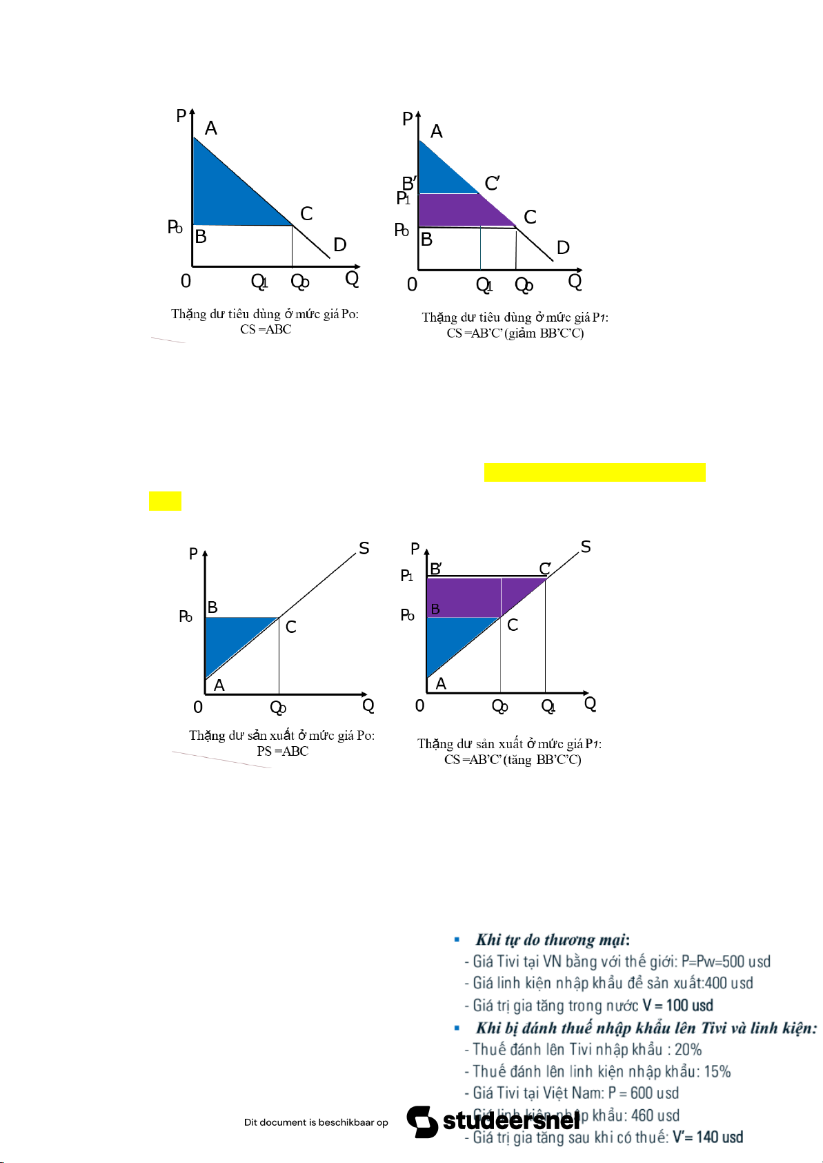 •Thặng dư tiêu dùng giảm (người tiêu dùng thiệt hại do giá tăng): ΔCS = – (a+b+c+d)