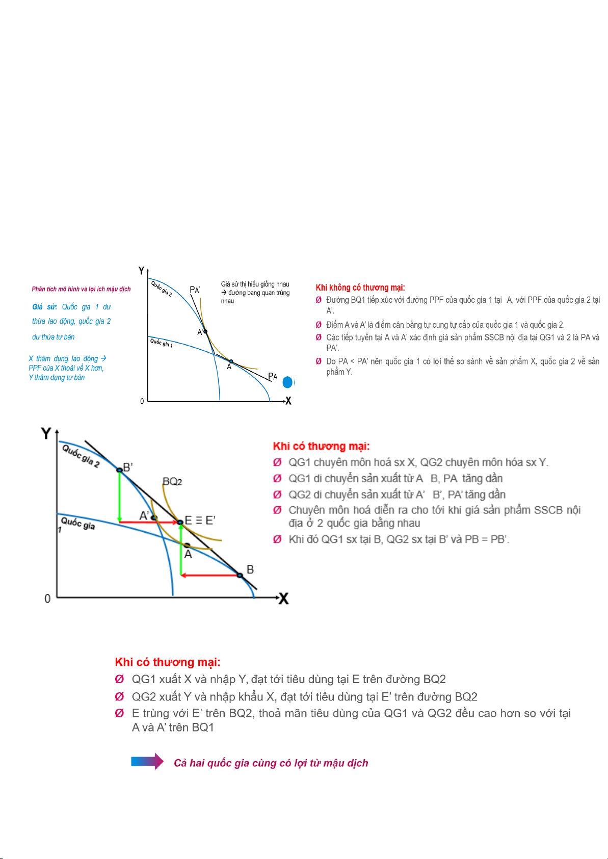 => Mô hình mậu dịch: Quốc gia 1 xuất khẩu X, nhập khẩu Y; Quốc gia 2 xuất khẩu Y, nhập X -